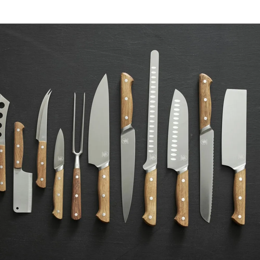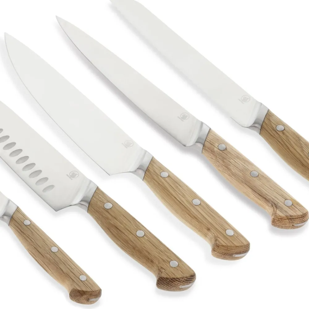 Knivsættet med kokkekniv, brødkniv, filetkniv, santokukniv og urtekniv gør det nemt at kreere velsmagende retter. Knivbladene er udført i rustfrit kvalitetsstål og håndtagene i olieret eg, som ved brug vil udvikle patina og blot blive smukkere, jo mere knivene bruges. Træhåndtagene er udformet af ét stykke træ og er behagelige at holde om. Santokuknivens blad er designet med luftskær, der sørger for, at det afskårne ikke sætter sig fast på bladet.