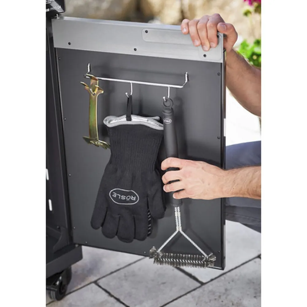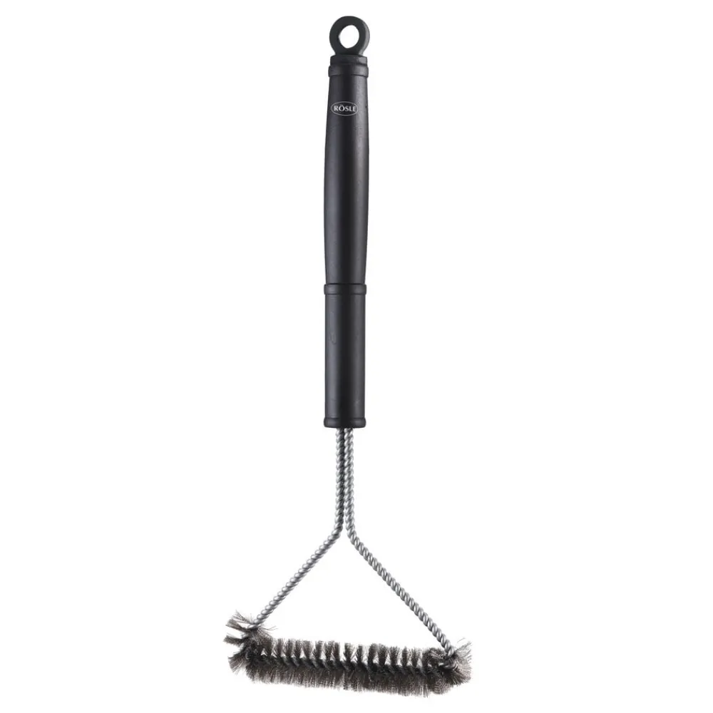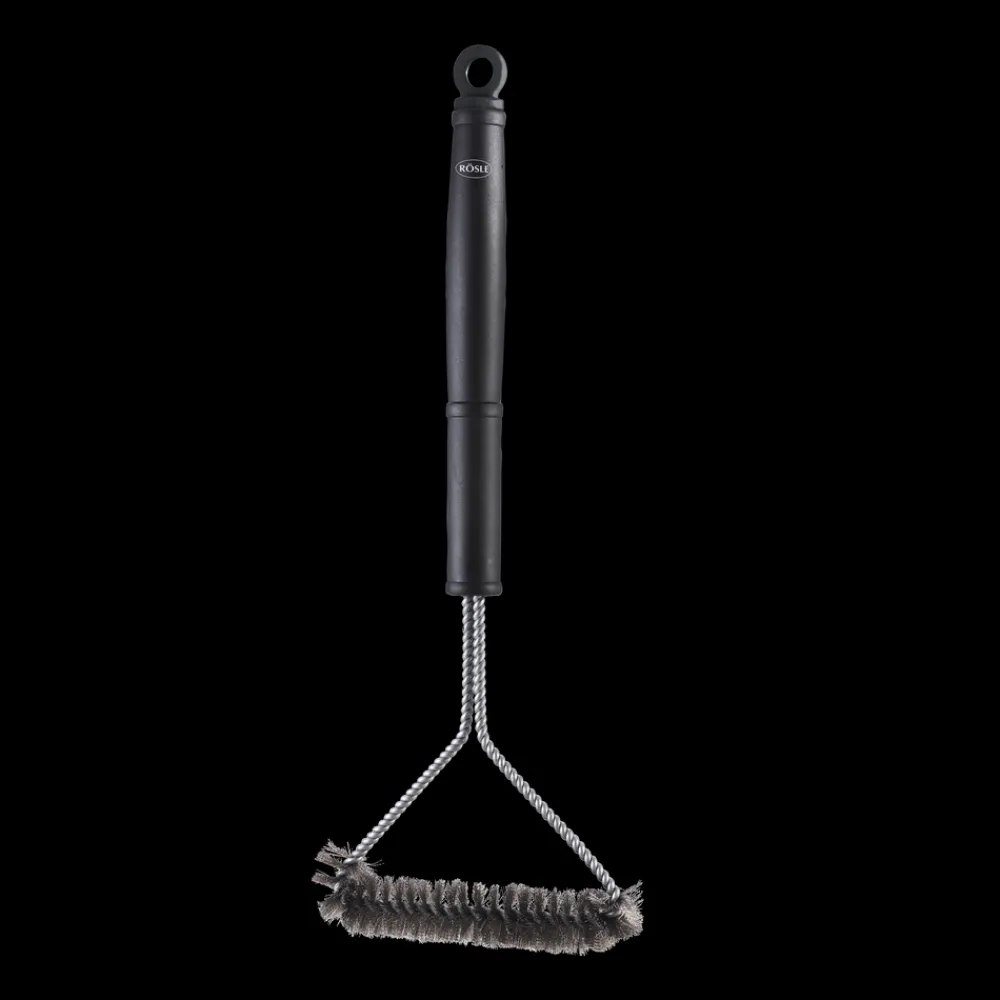 Grillbørste til rengøring af grillriste lavet af rustfrit stål, krom og emalje. Børstehoved af stål. Begge sider kan anvendes. Børsten er 16,5 cm bred. Ergonomiske håndtag af sort plastik.