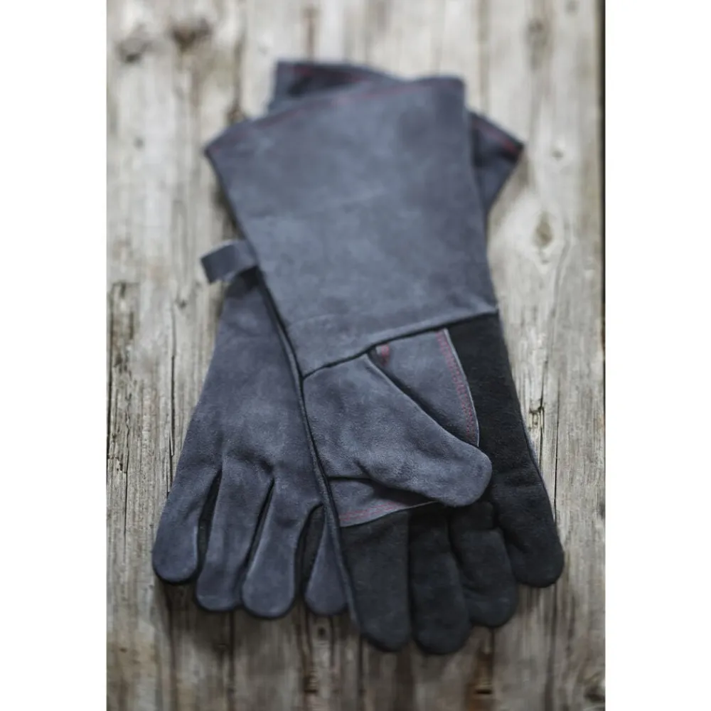 2 stk. lange og robuste grillhandsker af 100 % læder, beskytter hænder og arme mod varme og gløder.