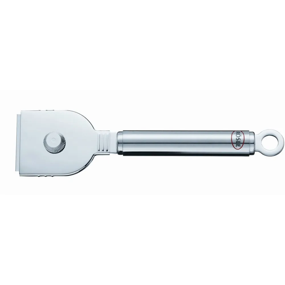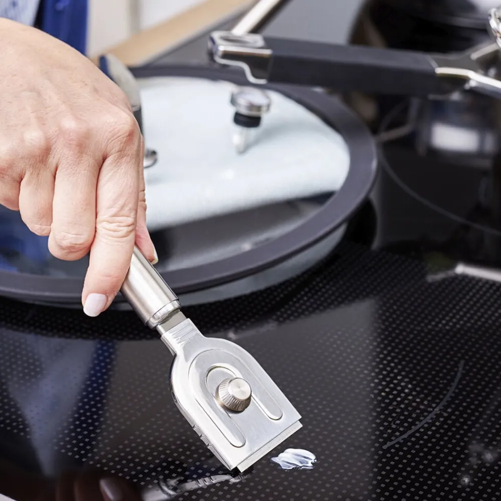 RÖSLE skraberen i rustfrit stål fjerner nemt brændte madrester fra kogepladen. Skraberens blade kan skubbes ind og ud, og sikrer sikker opbevaring i skuffen. Bladene kan udskiftes ved behov.