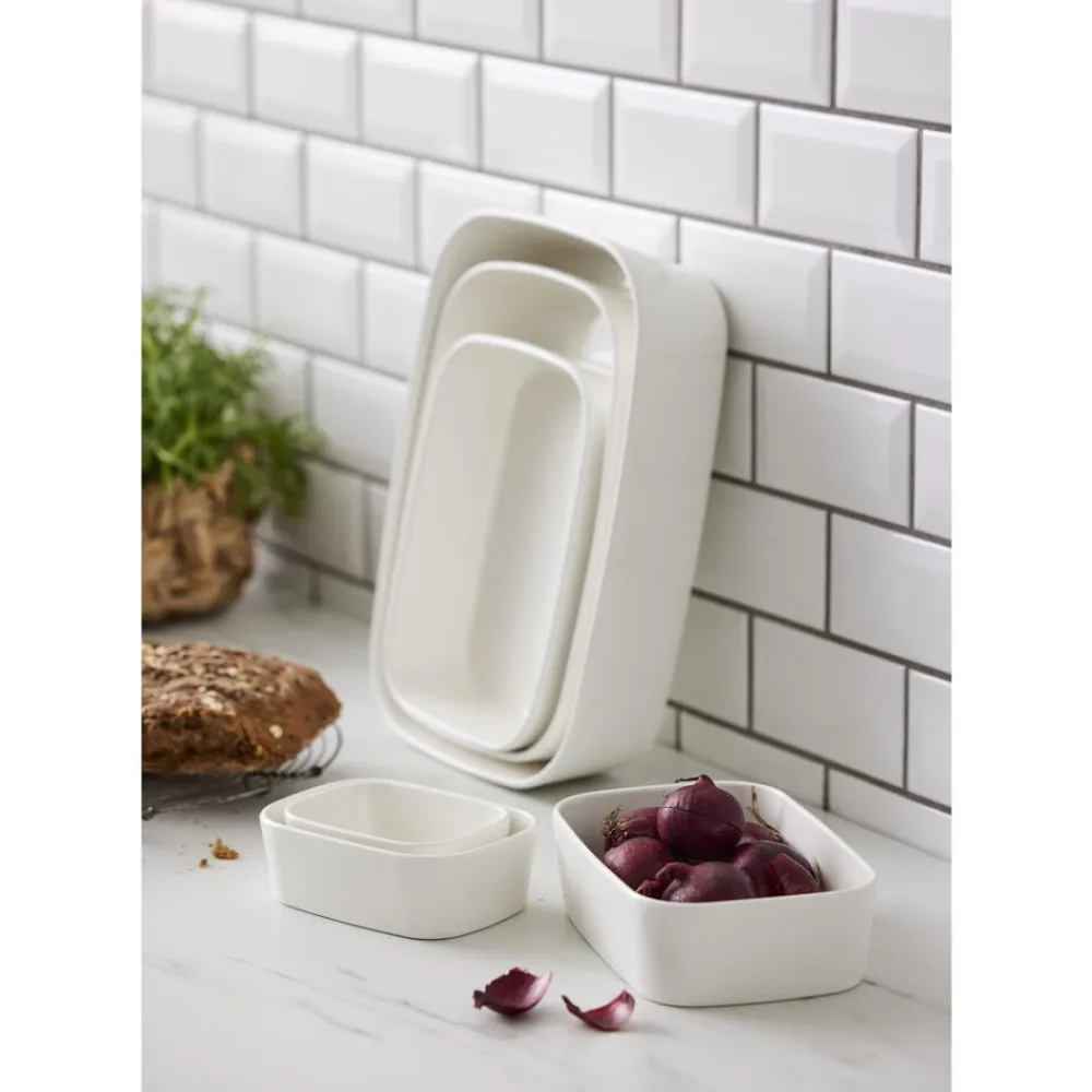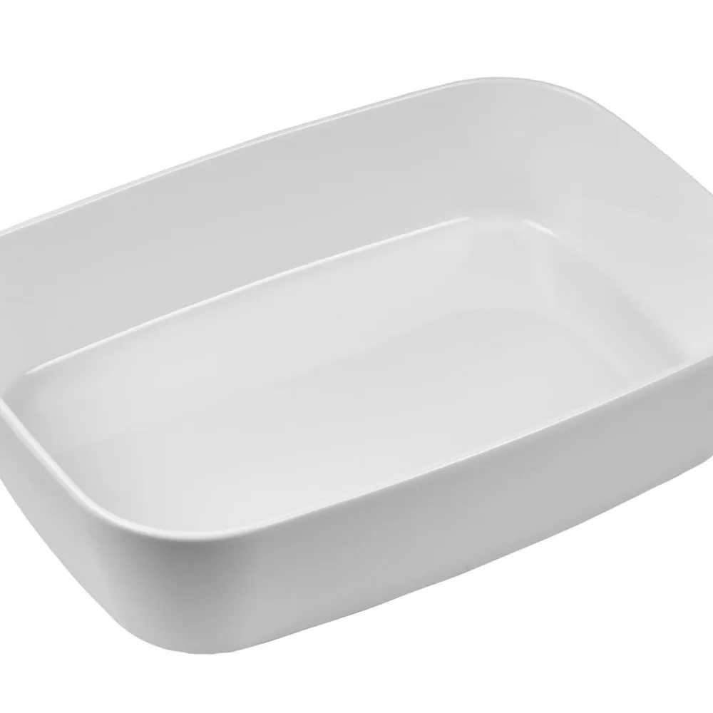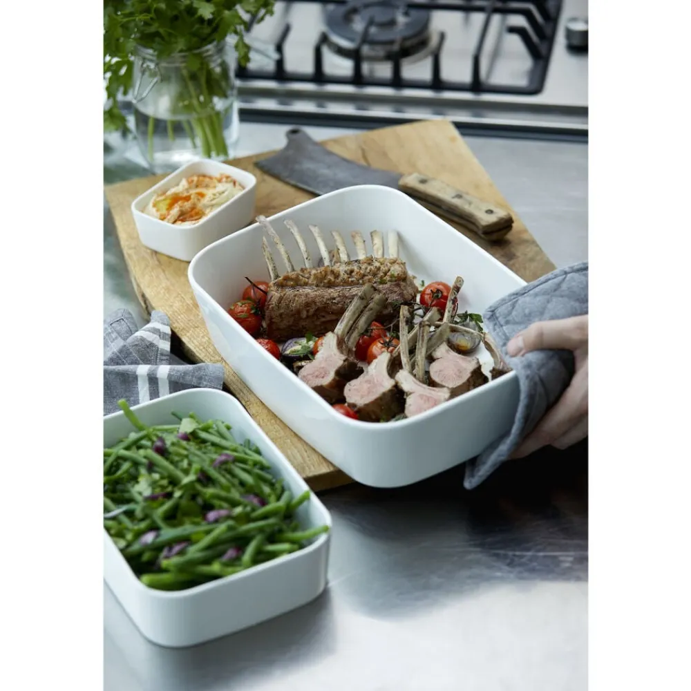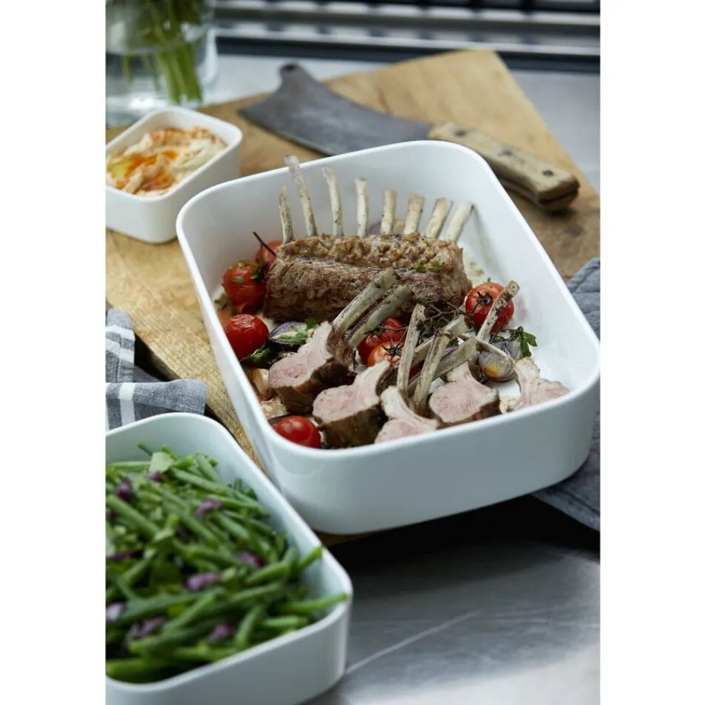 Ovnfast fad i hvidt porcelæn til det skandinaviske køkken. Fadet er fremstillet i forstærket porcelæn, der kan tåle ovntemperatur helt op til 350 grader. Den høje kant og praktiske form giver mange anvendelsesmuligheder. 35 x 25 x 8 cm.