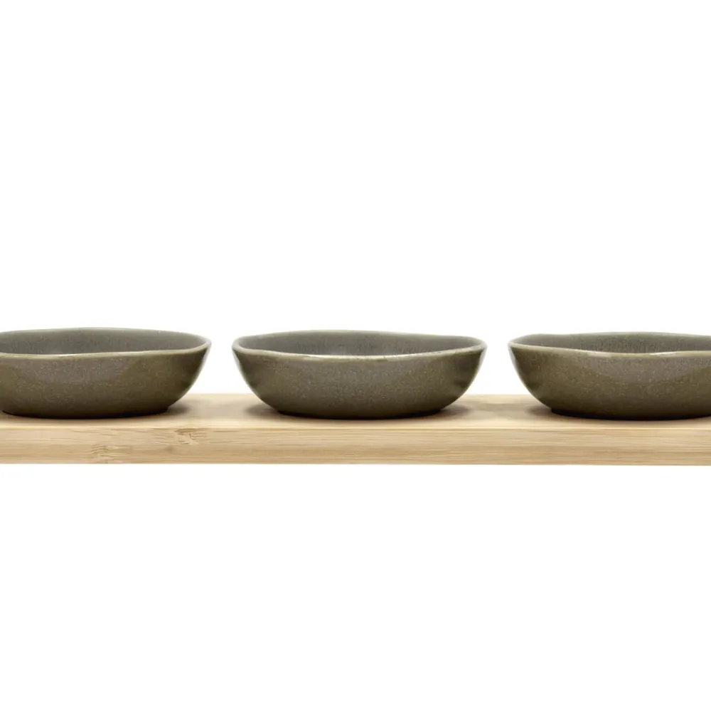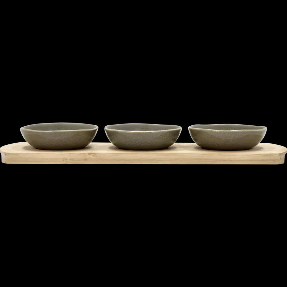 Denne bambusbakke med tre skåle er perfekt til servering af snacks, dips eller små forretter. Materialerne bambus og stentøj kombineret med Shoku-designets enkle linjer gør den ideel til både daglig brug og særlige lejligheder. Skålene er egnede til mikroovn og ovn op til 220 grader og kan vaskes i opvaskemaskine, mens bambusbakken skal vaskes i hånden.