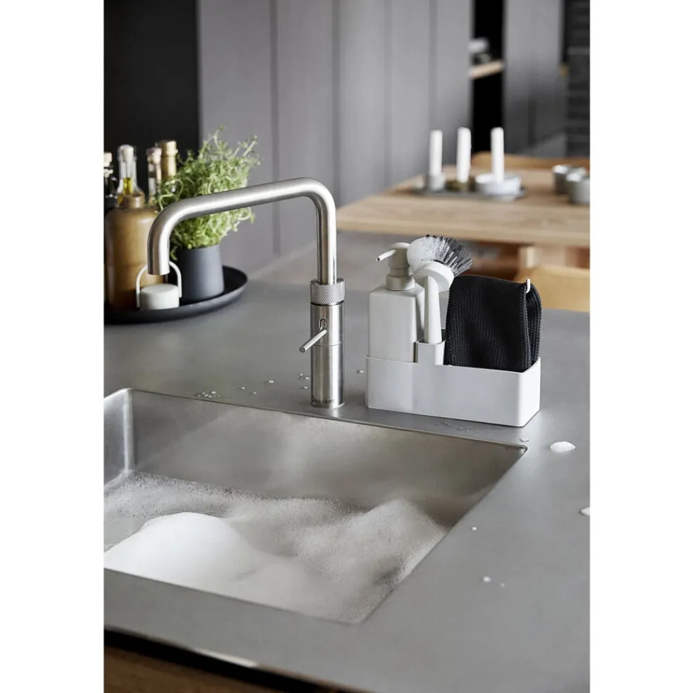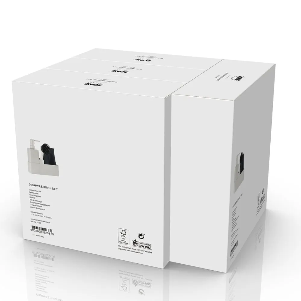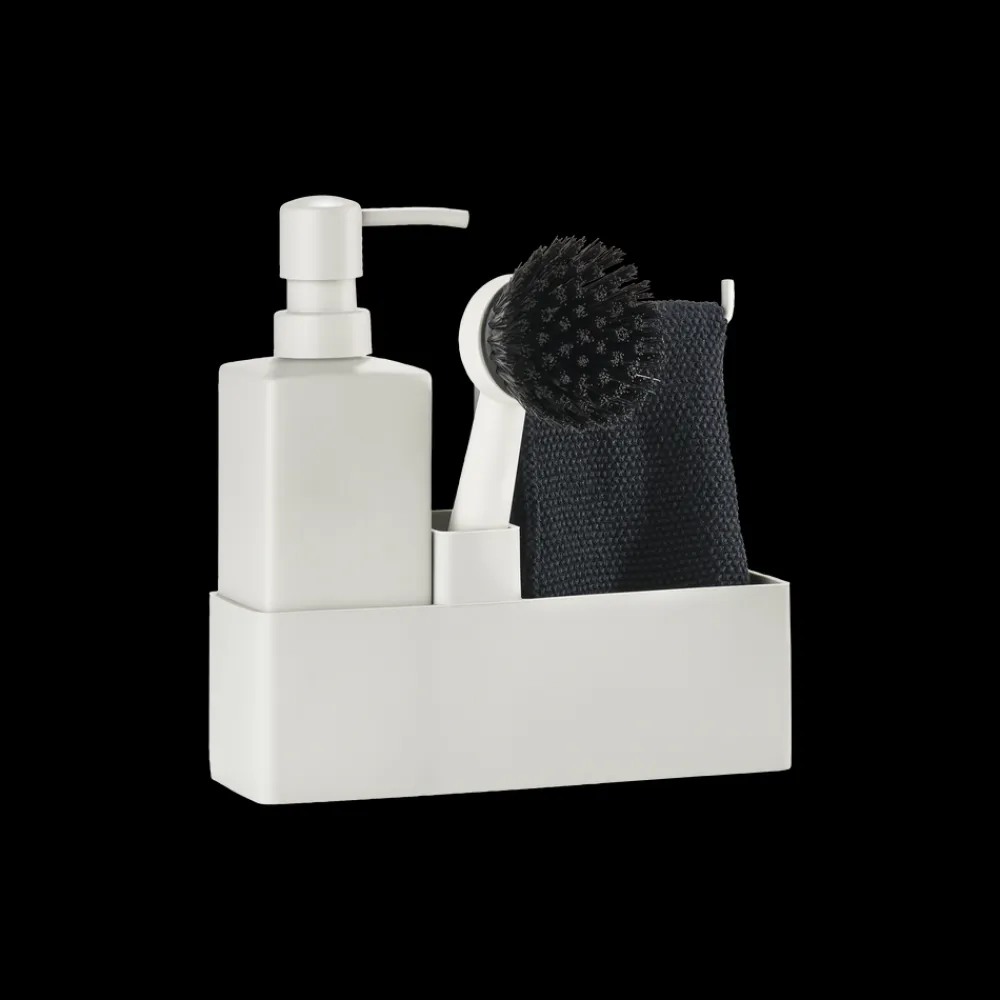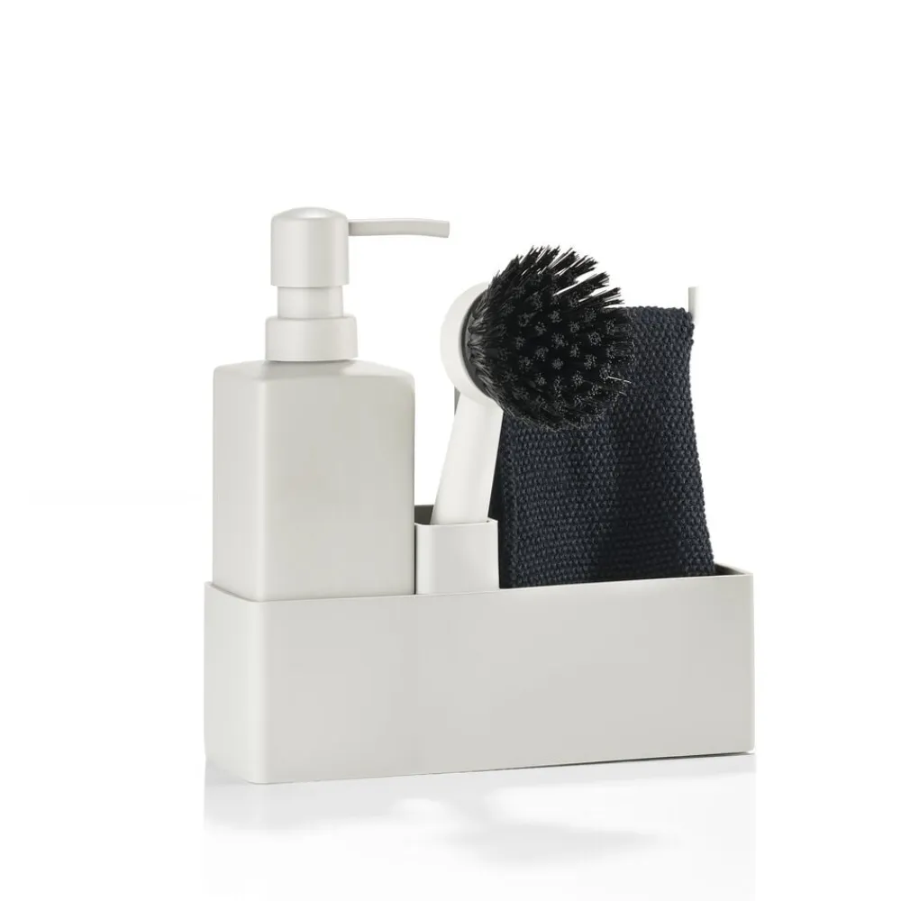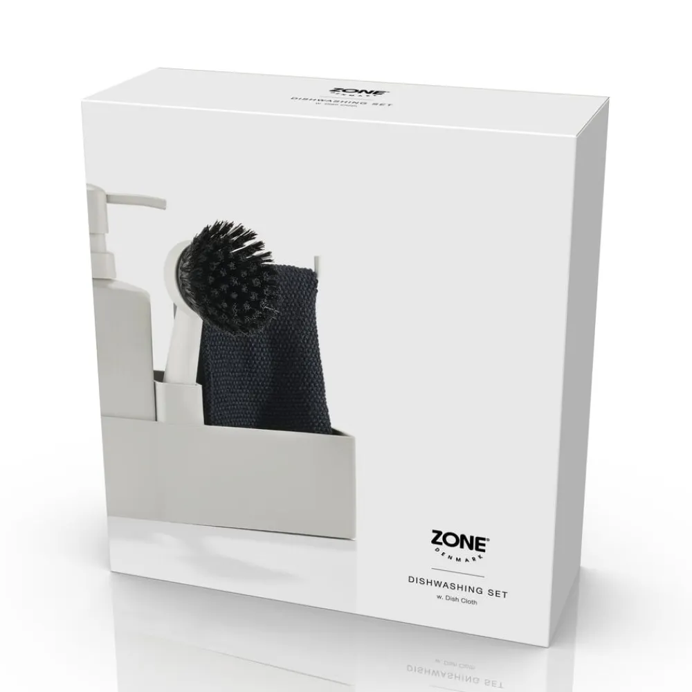 Zones populære alt-i-ét opvaskesæt med karklud. Sæbedispenseren er fremstillet i solid keramik, og opbevaringsdelen er i ridsefri og rengøringsvenlig silikone. Børsten kan stå selv, og børstehovedet kan udskiftes, så du altid har en frisk børste.