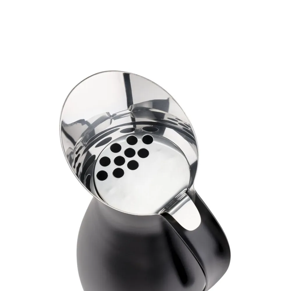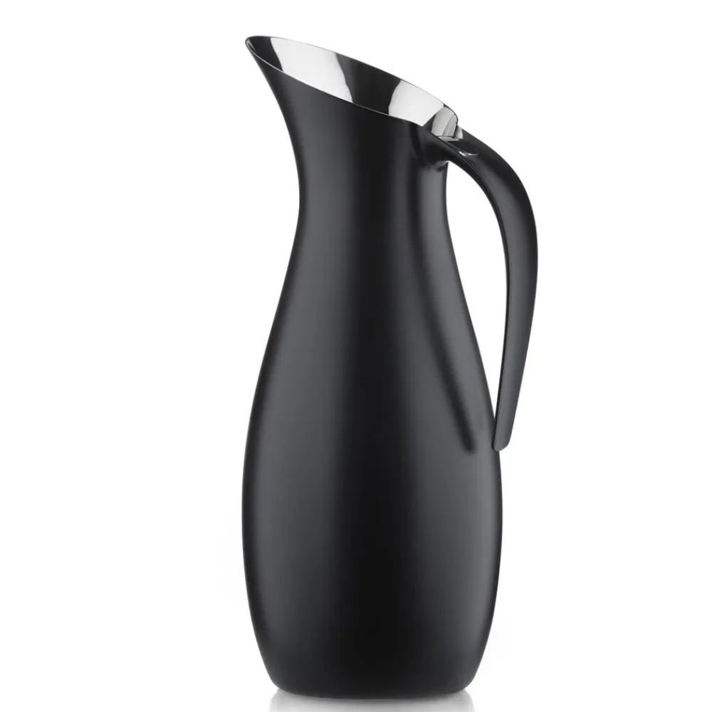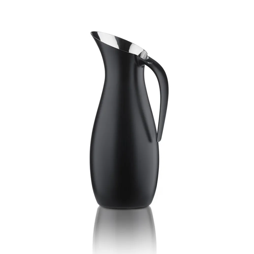 Eksklusiv, mat sort stålkande med sort nylonhåndtag i et stilrent og moderne design. Kontrasten til den blankpolerede inderside giver kanden et meget elegant udtryk. Toppen er forsynet med et aftageligt isfilter, der forhindrer isterninger og evt. lime- eller citronbåde i at komme med ud, når man hælder. Fremstillet i 18/8 stål. Højde 30 cm og en diameter på 12 cm.