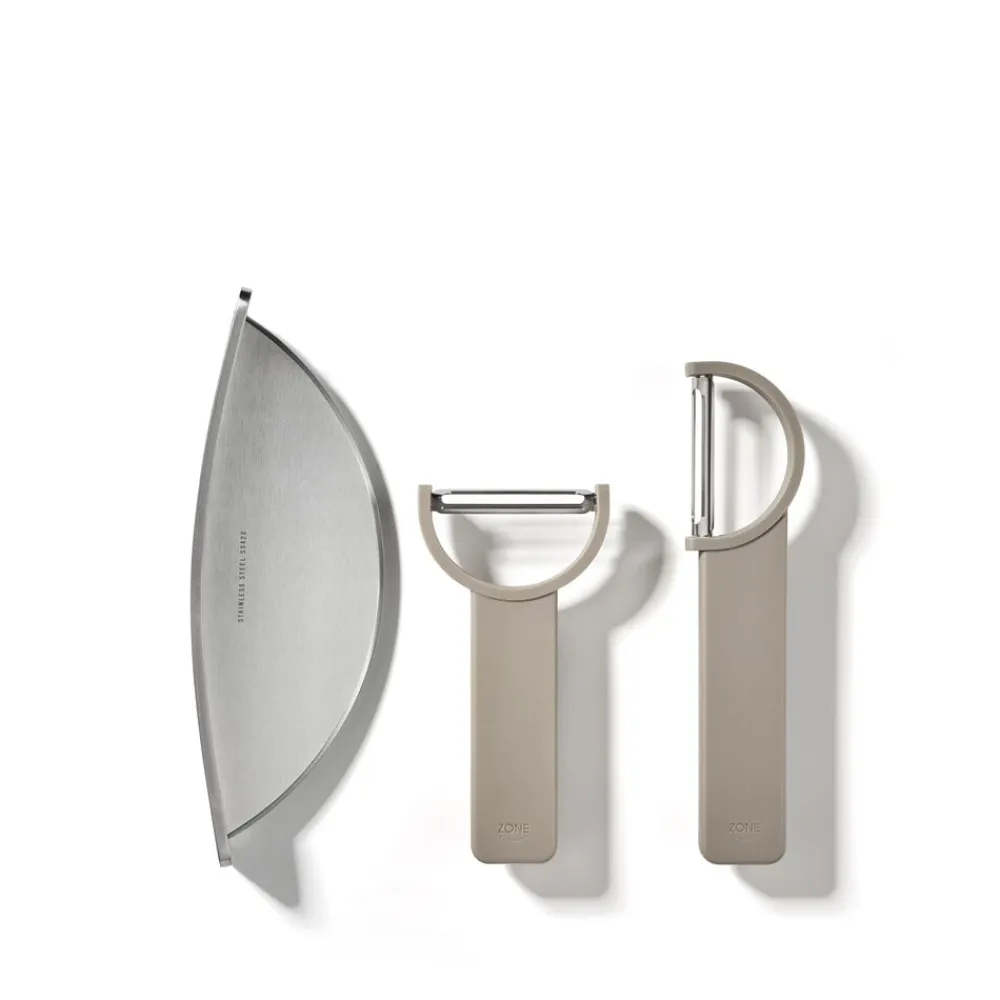 Snittesættet er et sæt af 3 dele, nemlig vuggekniv og to forskellige grøntsagsskrællere.