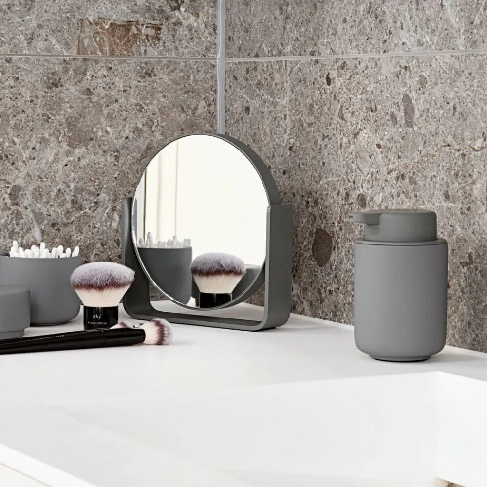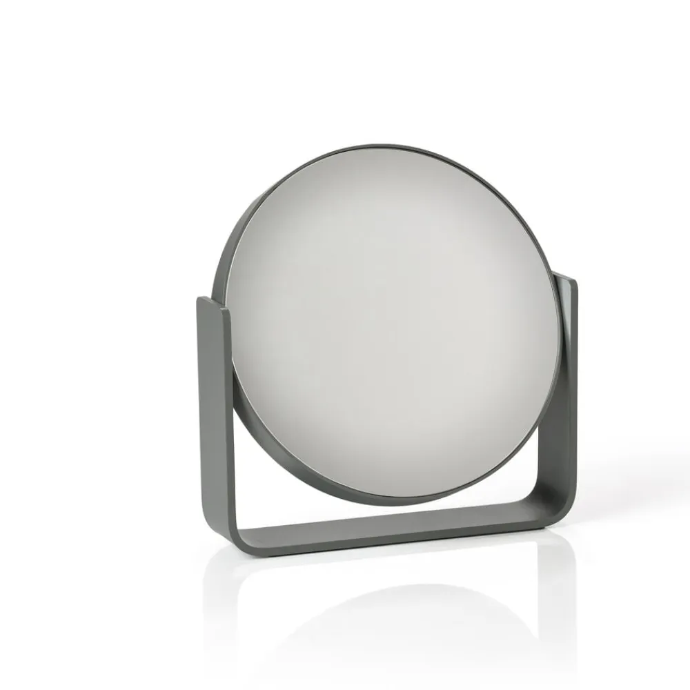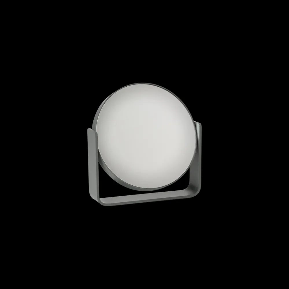 Uundværligt bordspejl, der pynter, hvor end du placerer det. Den ene side er almindeligt spejl, mens den anden forstørrer hele fem gange. Spejlet roterer sikkert om egen akse, da det bæres af en bred aluminiumsramme, som samtidig udgør spejlets stabile base. Det er pulverlakeret og har et fint mat look. Spejlet glider smukt ind i den populære UME-serie og fås i alle 7 farver: Black, White, Soft Grey, Grey, Eucalyptus, Taupe, Olive Green.