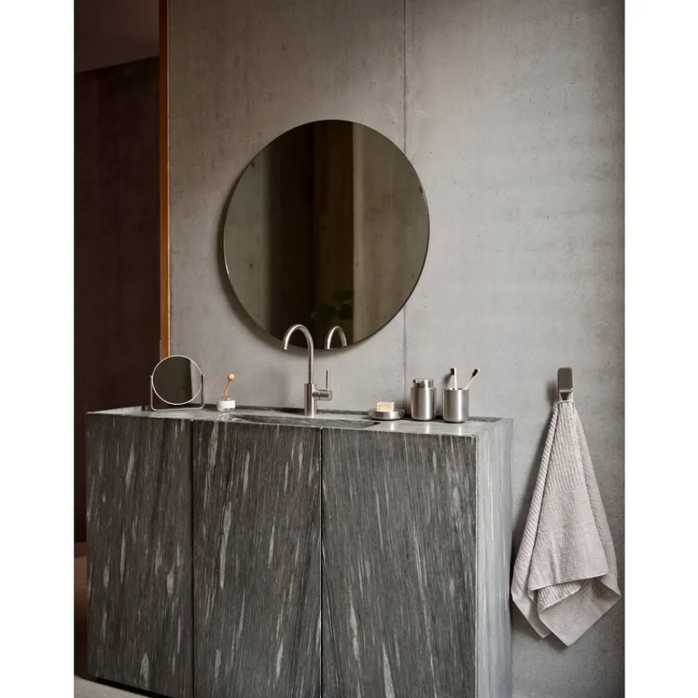 Til bordet findes både sæbedispenser, sæbeskål samt tandbørstekrus samt rundt bordspejl med vippefunktion. På trods af stålets mathed reflekterer lyset sig smukt i overfladen og giver overfladen liv og karaktér. Alt i alt en formfuldendt forvandling af en ægte Zone-klassiker.
