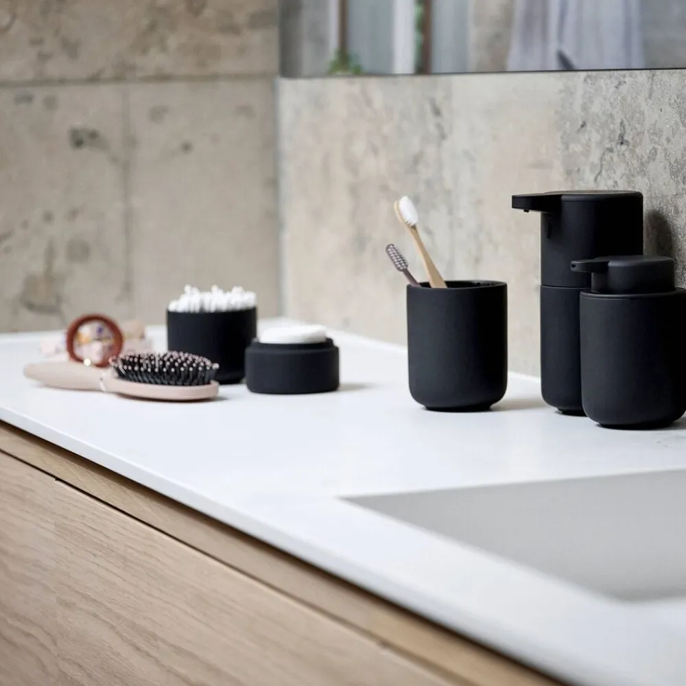 Sæbedispenseren har eksempelvis en lang tud for optimal pumpefunktion, ligesom toiletbørsten er udstyret med en praktisk inderkop, så overskydende vand let kan tømmes af – og så har børsten en god arbejdslængde og glider let på plads i holderen.