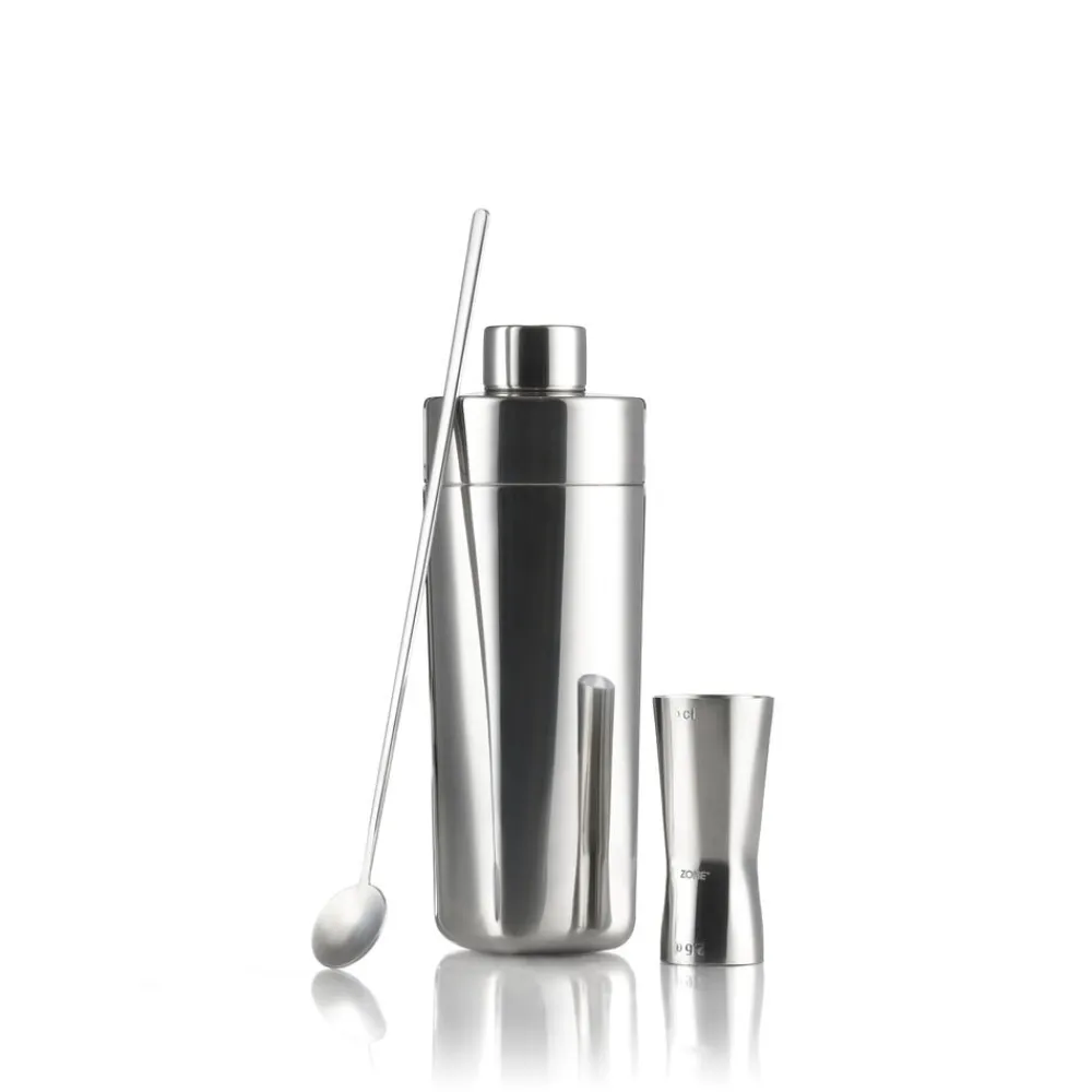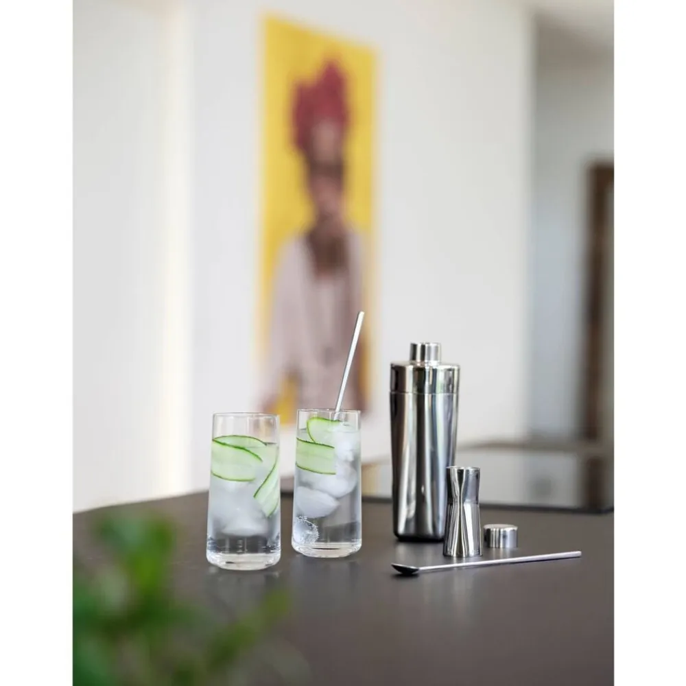 Barsættet består af Rocks shaker 400 ml, målebæger 2,5/5 cl og cocktailske i rustfrit stål.
