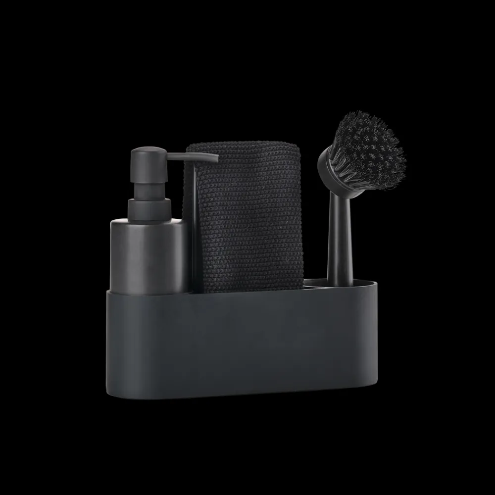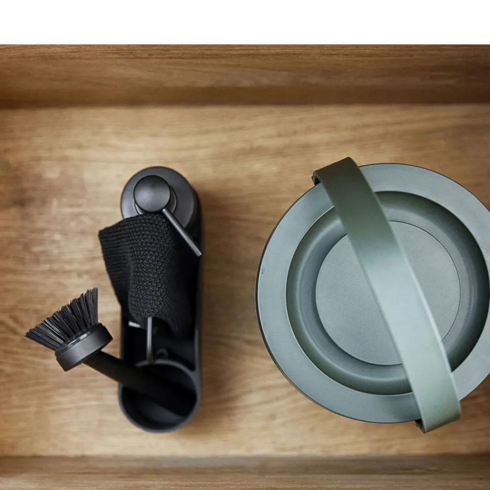 Rummet i midten af opvaskesættet kan eksempelvis indeholde skuresvamp og klud, mens metalbøjlen er både en praktisk hank og et glimrende tørrestativ for kluden.