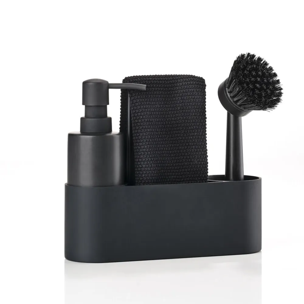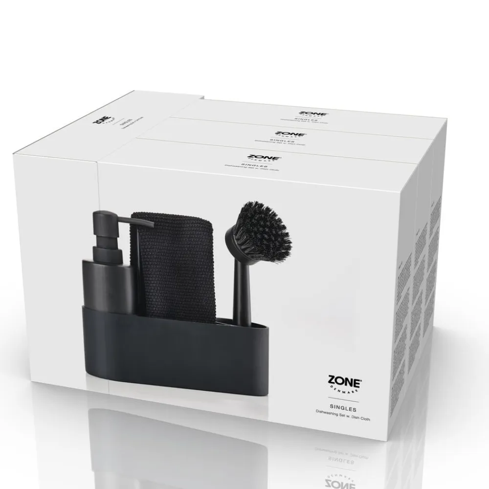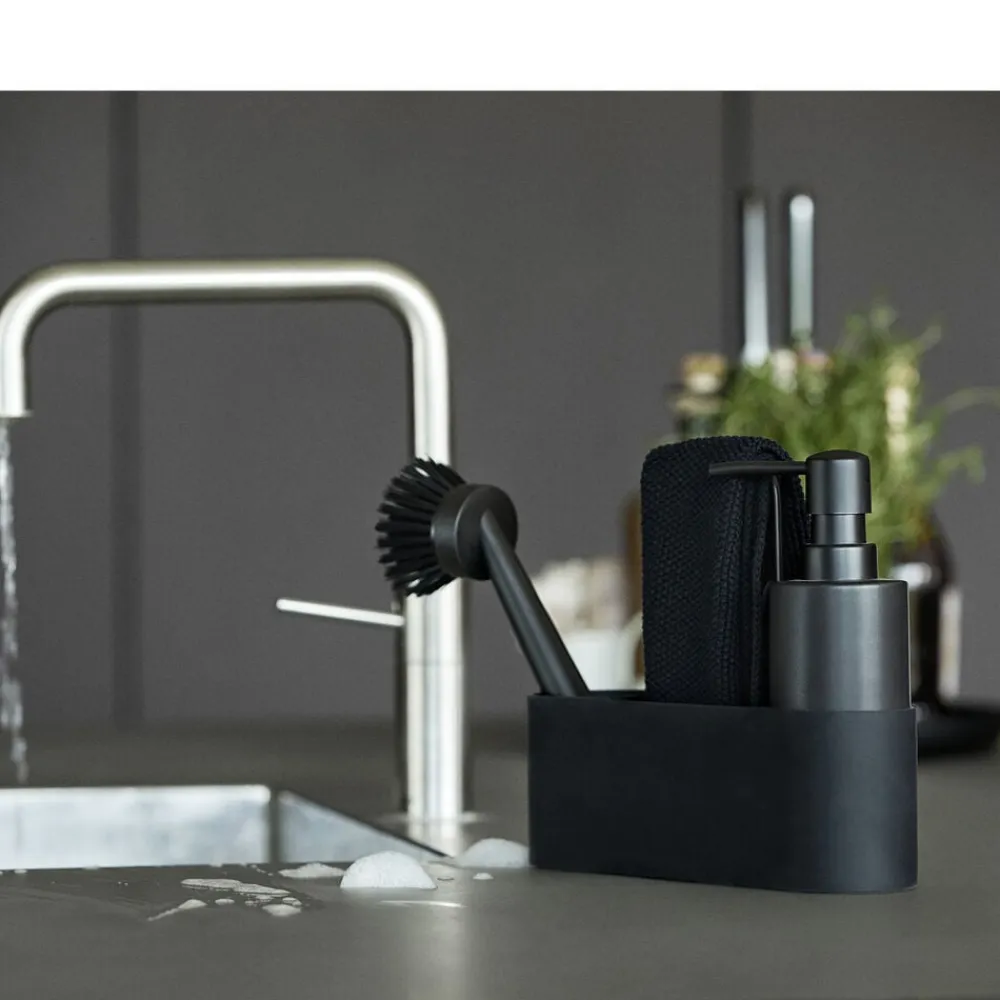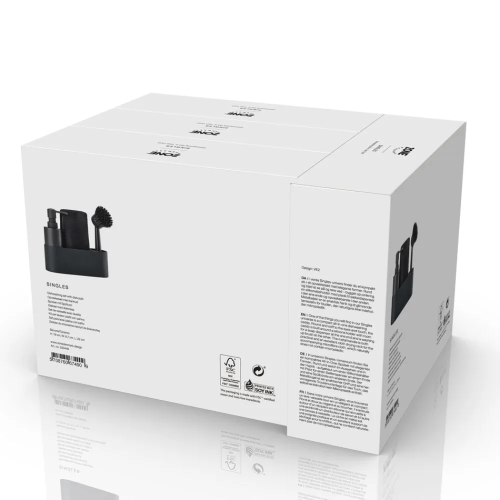 I vores Singles-univers finder du et kompakt alt-i-ét opvaskesæt, inkl. karklud, med elegante former. Rund og blød at se på og røre ved – bygget op omkring en silikonebeholder med plads til sæbedispenser i den ene ende og opvaskebørste i den anden.
