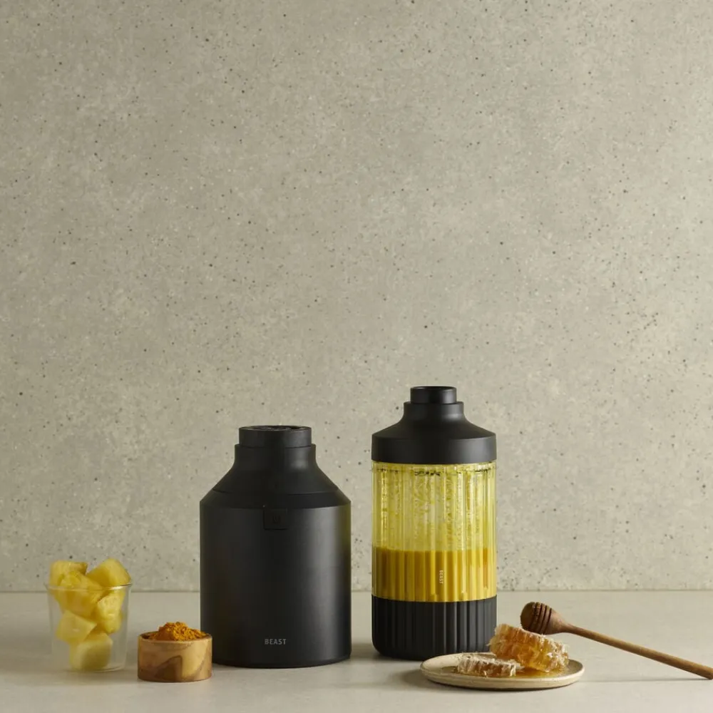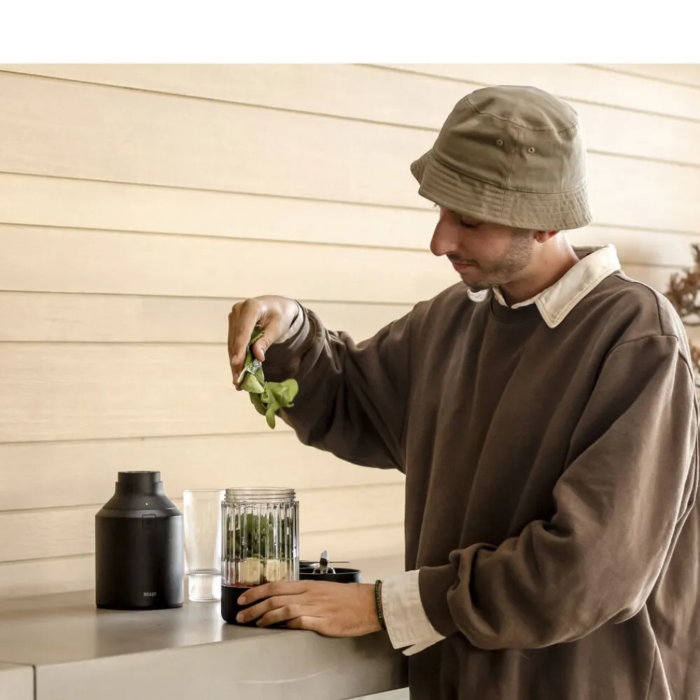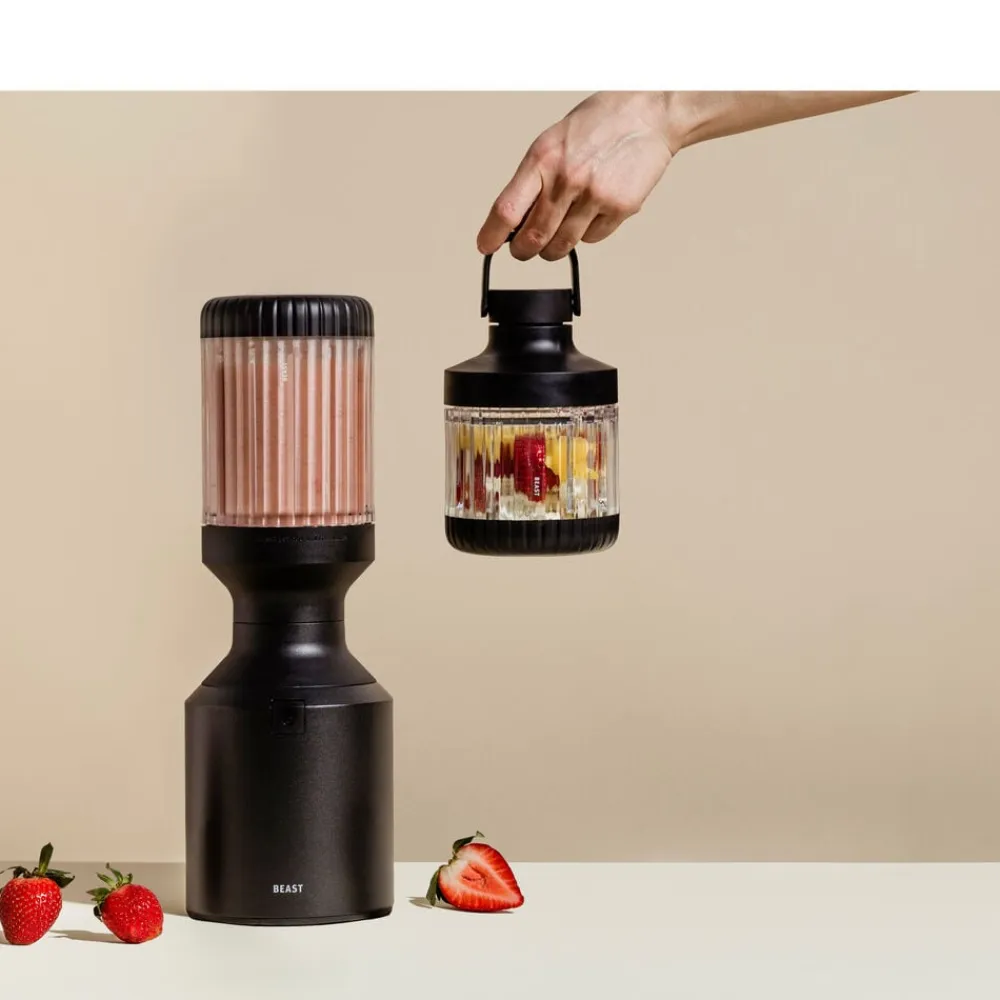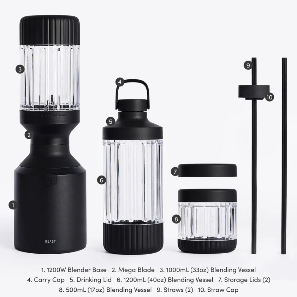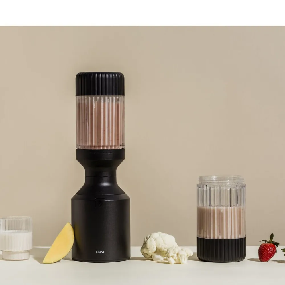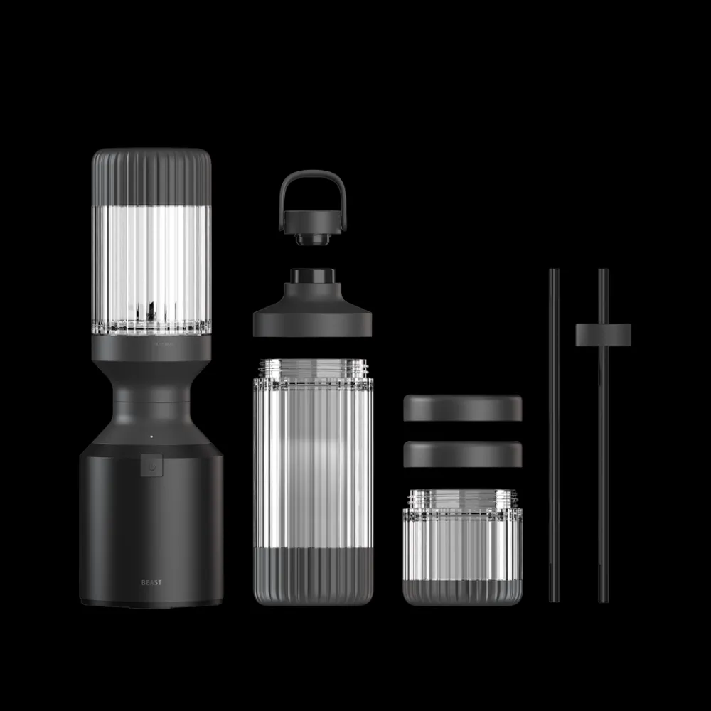 Beast Mega Plus 1200 leveres med tre blenderbeholdere (500, 1000 og 1200 ml), der fungerer som drikkebeholdere, når du sætter drikkelåg og sugerørshætte på og tager dem med dig på farten. Den rillede beholder giver dig et godt greb.