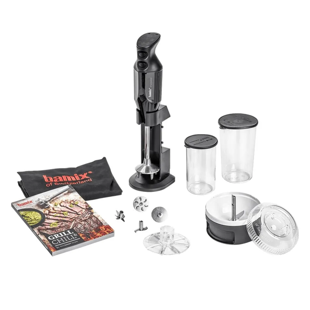 bamix® BBQ-stavblender med en kraftig 200 watt motor, der sikrer pålidelig hjælp til selv de hårdeste opgaver i køkkenet. Stavblenderen har to hastighedsindstillinger og en praktisk spiralledning, der giver masser af fleksibilitet. Til produktet medfølger multifunktionskniv, blenderskive, piskeskive, kød- og grøntsagskniv, processor, mixebægere med låg 400 og 600 ml, Deluxe bordstander, forklæde og opskriftsbog på grillmad samt en instruktionsmanual. Livstidsgaranti på motor.
