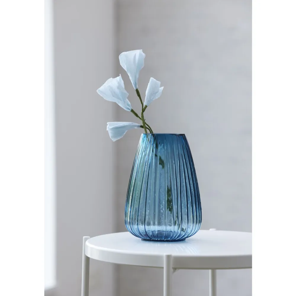 Den flotte vase i gennemfarvet glas har det samme fine, riflede look som Kusintha-seriens vandglas- og flasker. Vasen fås i grøn, amber, pink, blå og smoke. Når du køber fra Kusintha-kollektionen, støtter du samtidig udsatte børn i verdens fattigste områder. 22 cm høj.