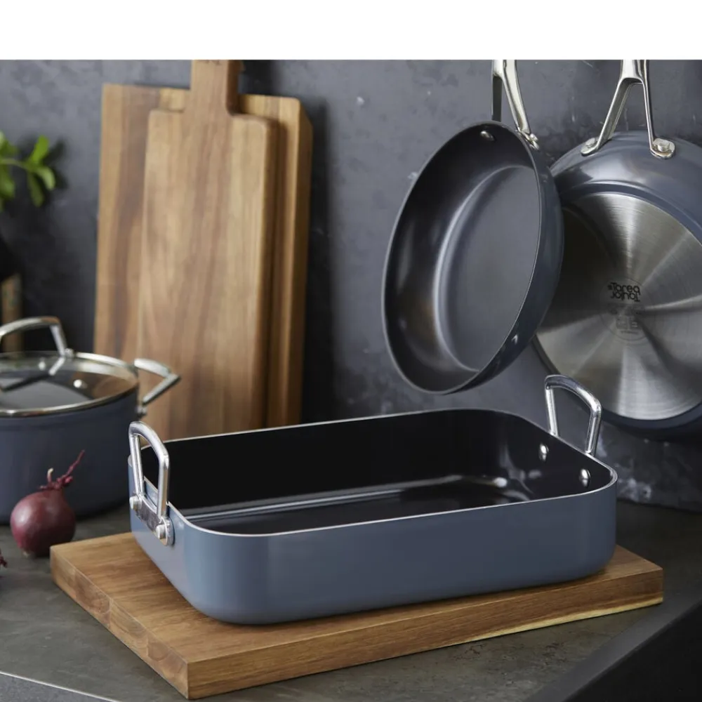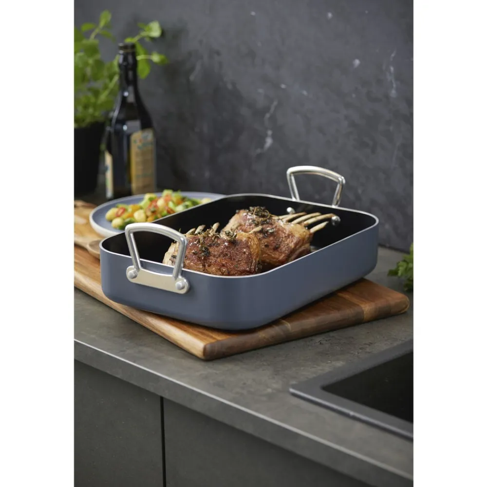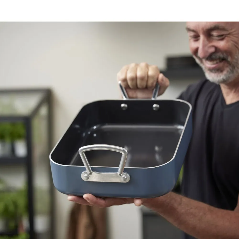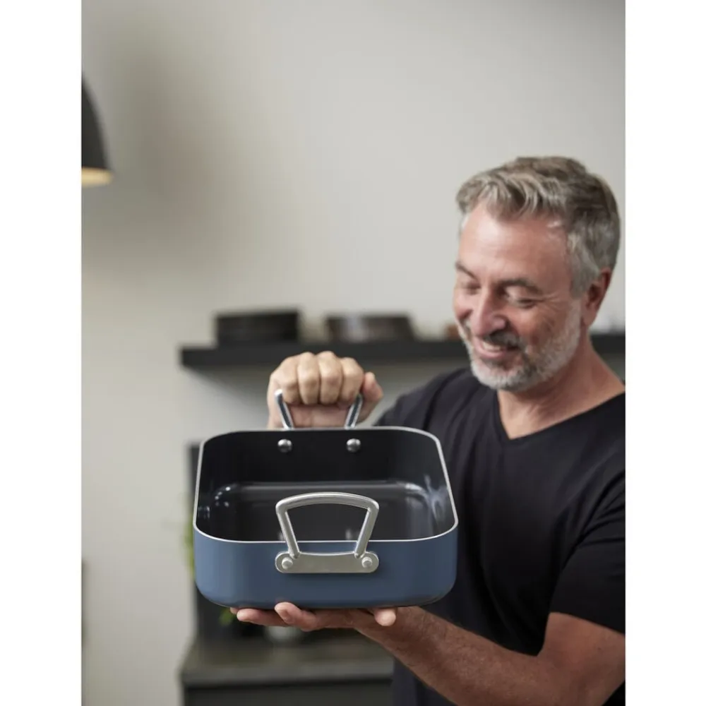 Bradepande fremstillet af aluminium, som sikrer, at varmen fordeles og fastholdes jævnt og effektivt over både bund og sider. Bradepanden har en tolags keramisk belægning med non-stick-funktion og tåler op til 220 grader C i ovnen. Tåler alle typer redskaber. Håndtag af aluminium. Håndopvaskes.