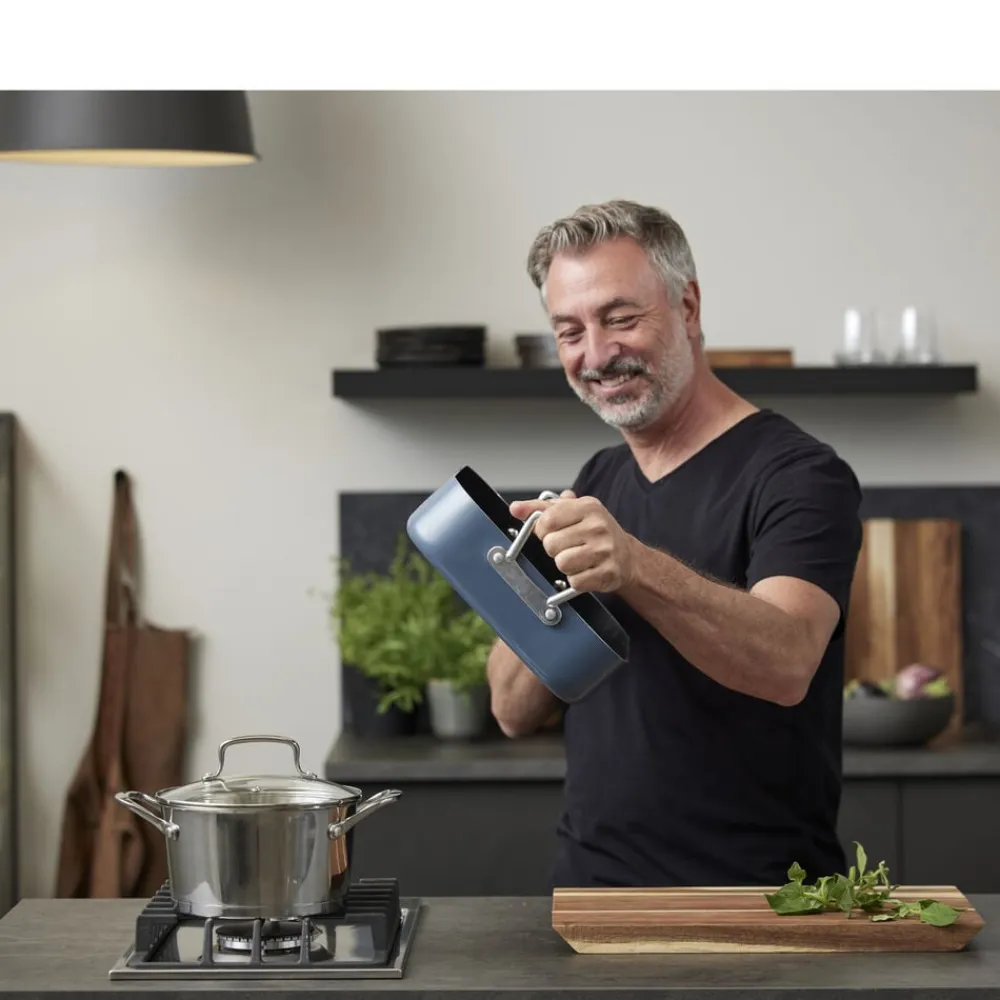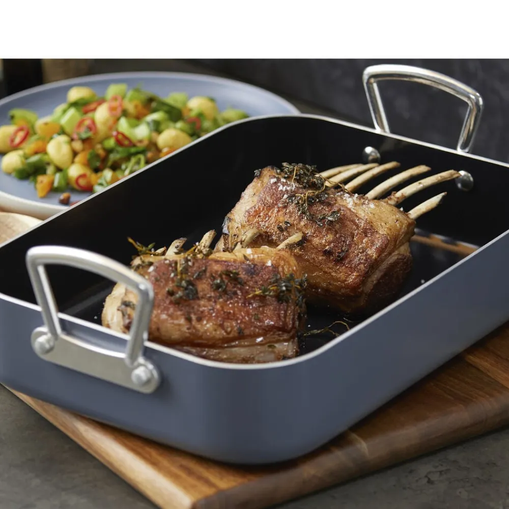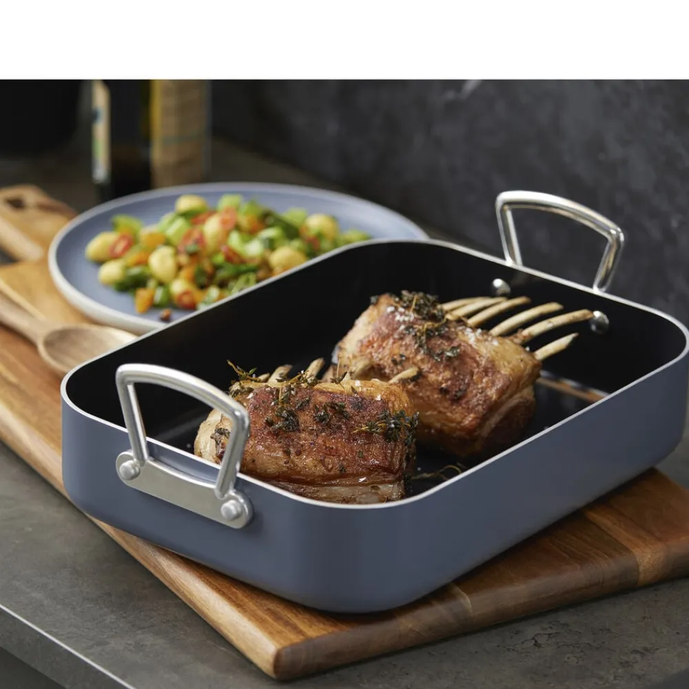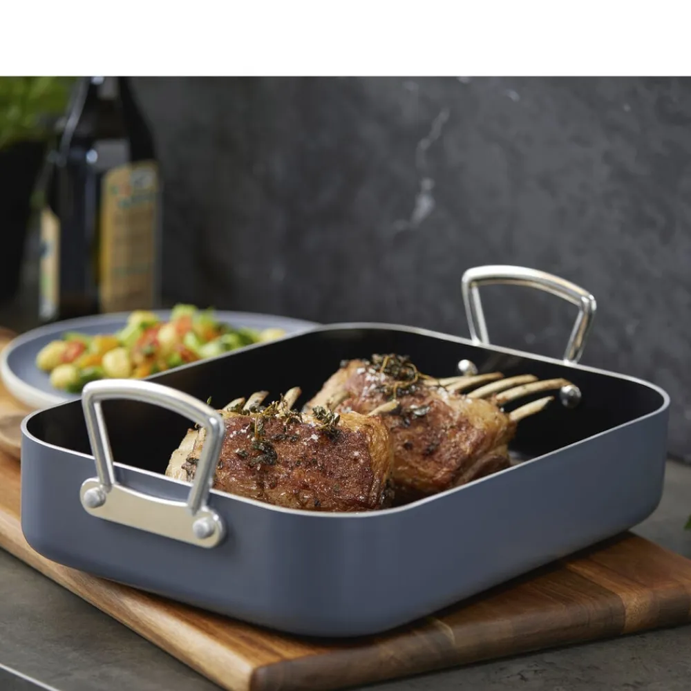 Bradepande fremstillet af aluminium, som sikrer, at varmen fordeles og fastholdes jævnt og effektivt over både bund og sider. Bradepanden har en tolags keramisk belægning med non-stick-funktion og tåler op til 220 grader C i ovnen. Tåler alle typer redskaber. Håndtag af aluminium. Håndopvaskes.