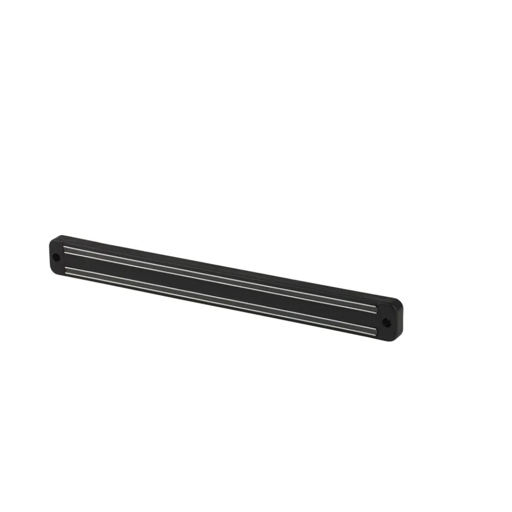 Knivmagneten i sort stål holder styr på de skarpe knive.