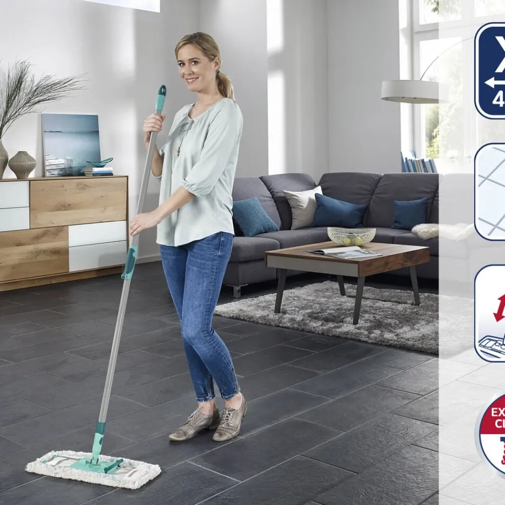 Med det fleksible 360 ° drejeled kan du effektivt føre gulvmoppen rundt i bløde sving og komme ubesværet omkring bord- og skabsben og under møbler og senge. Dobbeltfiber-kluden når de mindste fordybninger og fjerner selv genstridigt snavs grundigt.