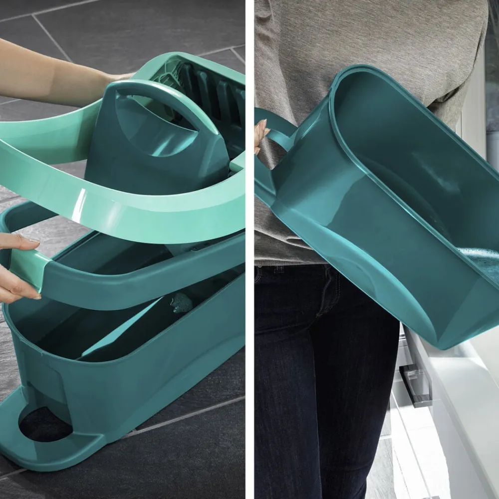Med Profi XL Mobile gulvspand med vridesystem bliver gulvvasken hurtigere og samtidig mere skånsom for både hænder og ryg. Du behøver hverken at få hænderne i vand eller at bukke dig ned. Du løsner bare kluden fra fladmoppens holder med et hurtigt tryk med foden, dypper kluden i spanden og placerer den i vrideren, som du også betjener med foden, og klikker den på plads i holderen. Lige så effektivt, som hvis du vred kluden med hænderne.