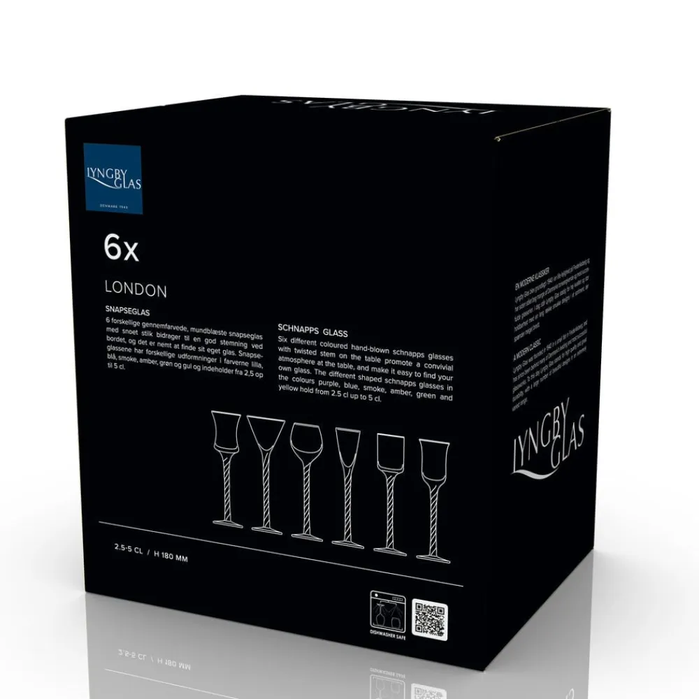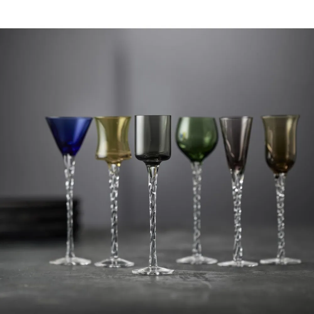 6 forskellige gennemfarvede, mundblæste snapseglas med snoet stilk bidrager til en god stemning ved bordet, og det er nemt at finde sit eget glas. Snapseglassene har forskellige udformninger i farverne lilla, blå, smoke, amber, grøn og gul og indeholder fra 2,5 op til 5 cl. H 18 cm.