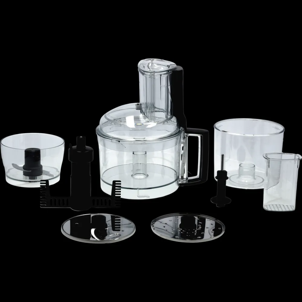 Magimix-sættet består af: 3 skåle, 1 låg, 2 nedstoppere, 1 x 2 mm snitteskive, 1 x 2 mm riveskive, 1 minikniv, 1 æggepisker og 1 aksel.