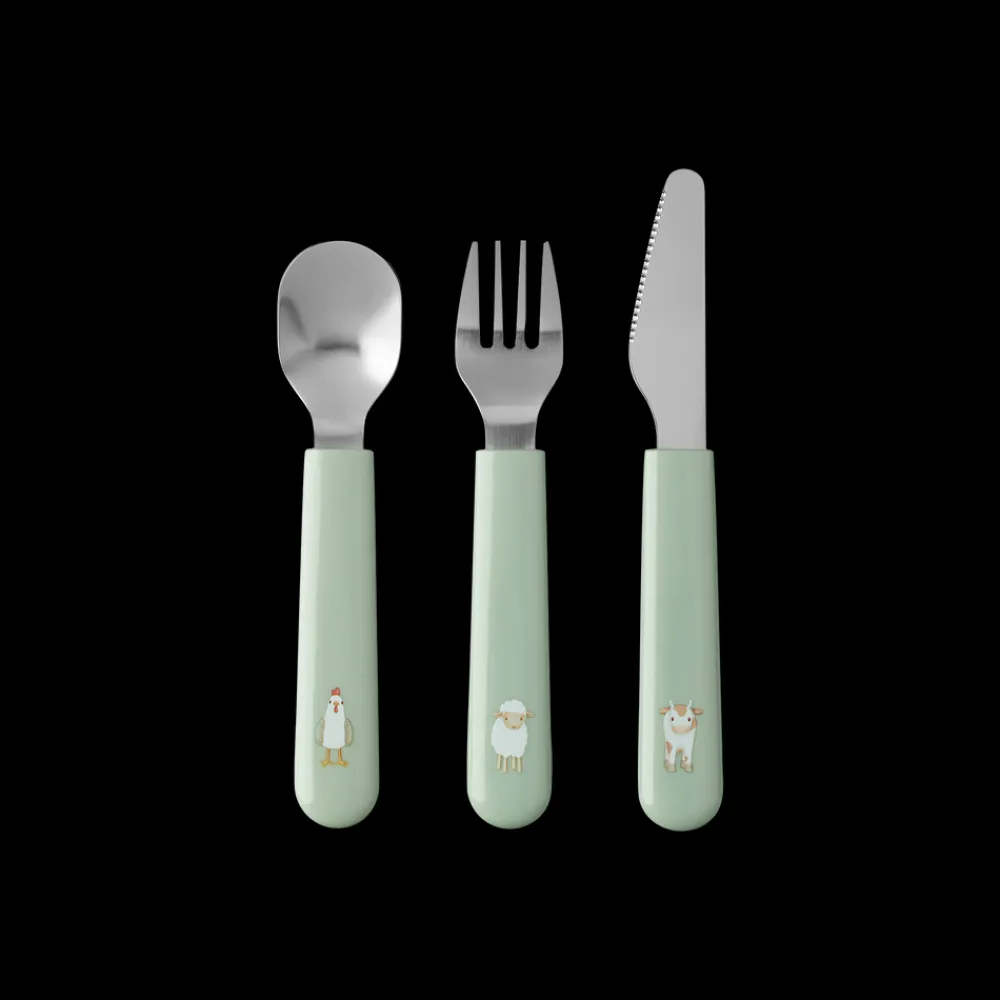 Funktionelt bestiksæt med kniv, gaffel og ske til småbørn, der spiser selv. Rustfrit stål med rundede plasthåndtag, der giver et behageligt greb. Kniven har skærekant på den ene side. Velegnet til opvaskemaskine. Fra 2-3 år. PP og rustfrit stål.
