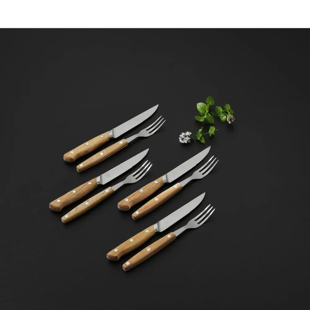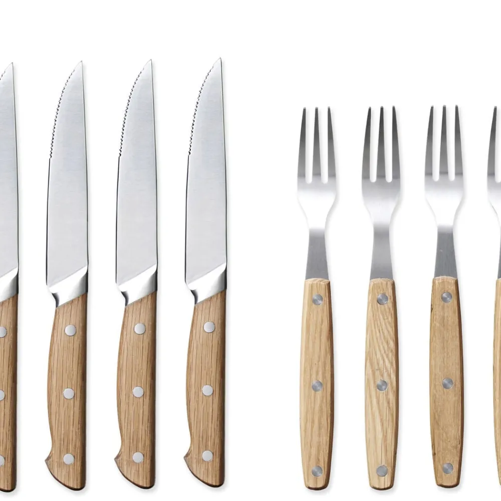 Gaflen og knivbladet er udført i rustfrit kvalitetsstål og håndtagene i olieret eg, som ved brug vil udvikle patina og blot blive smukkere, jo mere bestikket bruges. Træhåndtagene er behagelige at holde om.