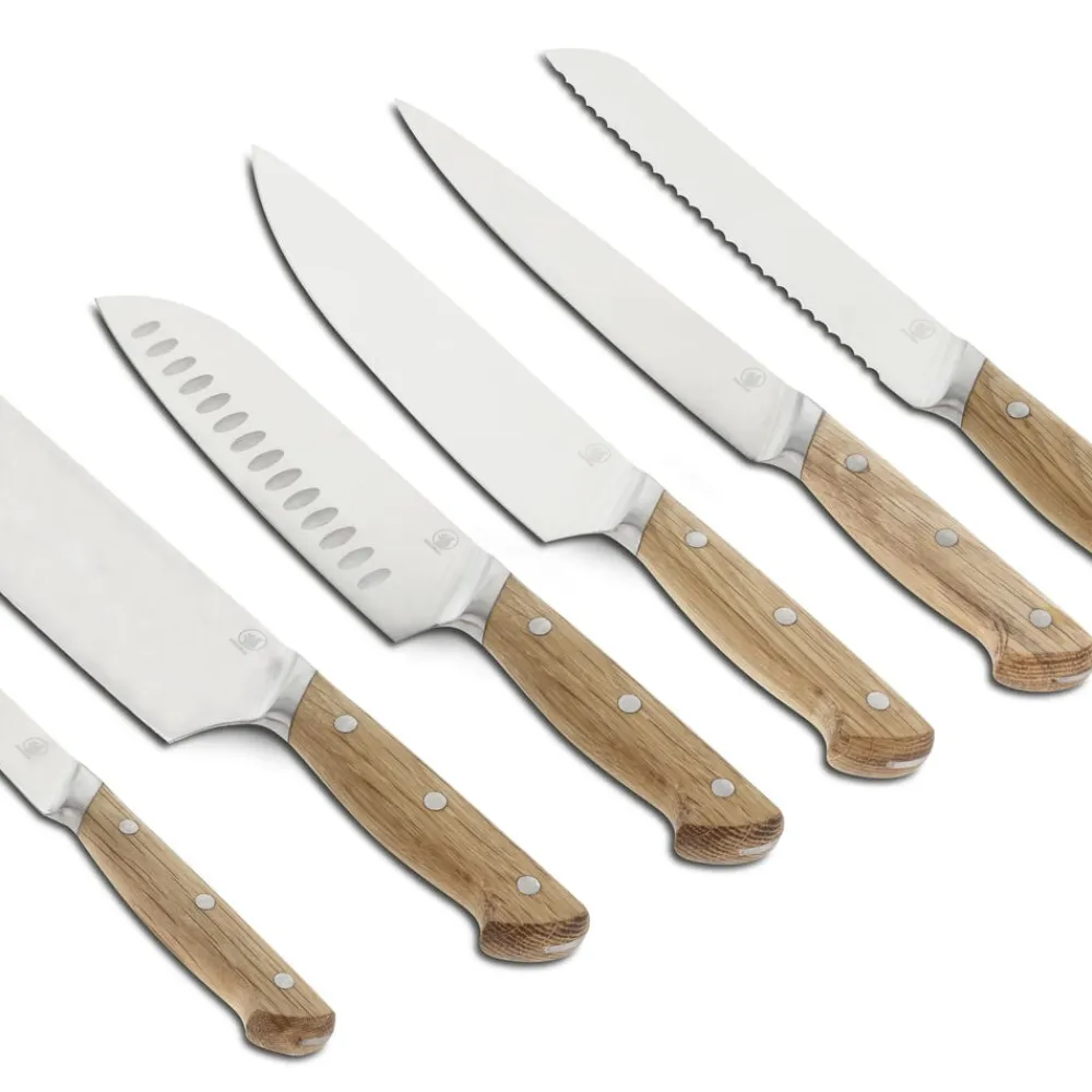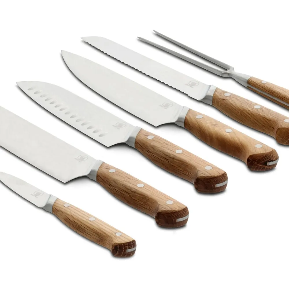 Knivbladet er udført i rustfrit kvalitetsstål og håndtaget i olieret eg, som ved brug vil udvikle patina og blot blive smukkere, jo mere kniven bruges. Træhåndtaget er udformet af ét stykke træ og er behageligt at holde om.