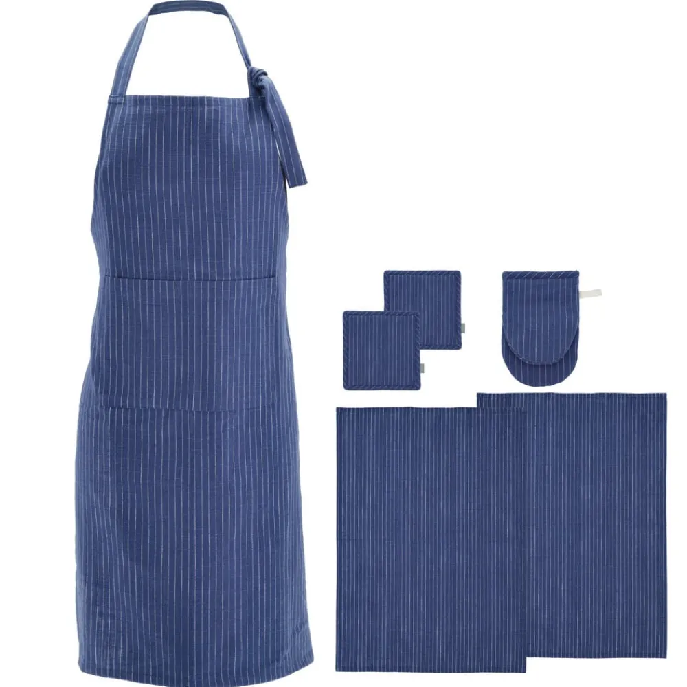 Tekstilsættet i 6 dele i økologisk bomuld består af forklæde 70 x 91 cm, 2 viskestykker 50 x 70 cm, miniovnhandske 14 x 21 cm og 2 grydelapper 20 x 20 cm.