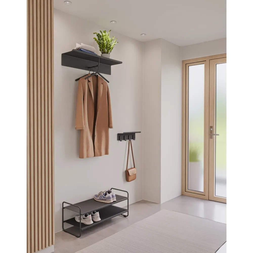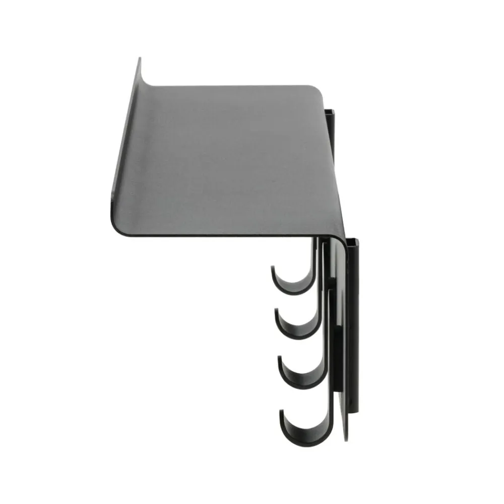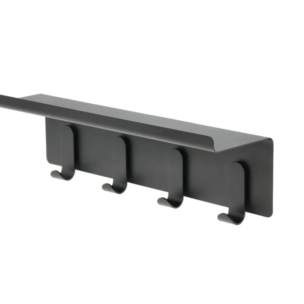 Minimalisme og funktion i smuk forening. Entréhylden med kroge er perfekt til de småting, som alle har, men ingen ved, hvor de skal placere. Vi nævner i flæng nøgler, mobiltelefoner, hundesnore, skohorn og handsker. Der er ingen synlige skruer. I stedet medfølger monteringsvenlige vægbeslag. Udført i pulverlakeret stål.