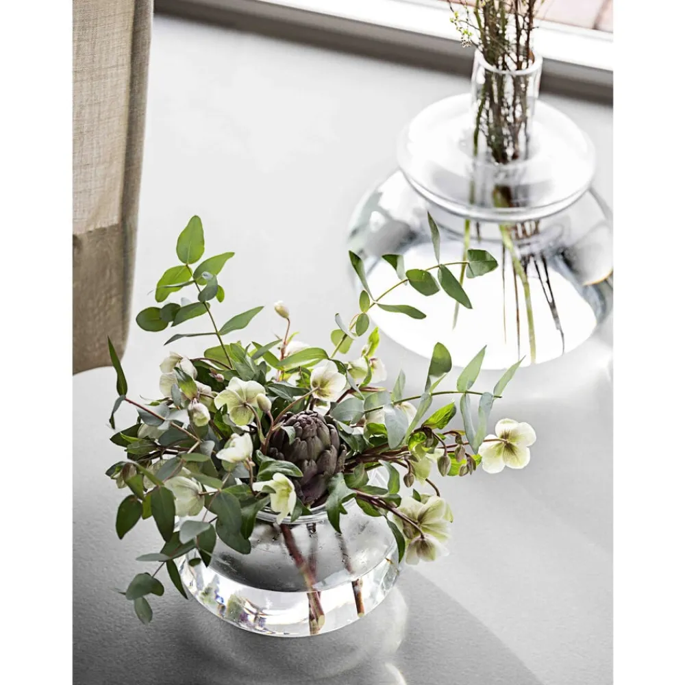 Vasen består af to dele, hvor topstykket kan vendes. Vender du halsen nedad, er vasen den perfekte base for høje buketter. Vender du halsen opad, støtter den elegant op om nogle få grene eller enkelte stilke. Fjerner du topstykket helt, har du en smuk organisk omfavnelse af store tætte buketter.