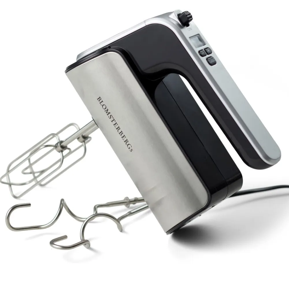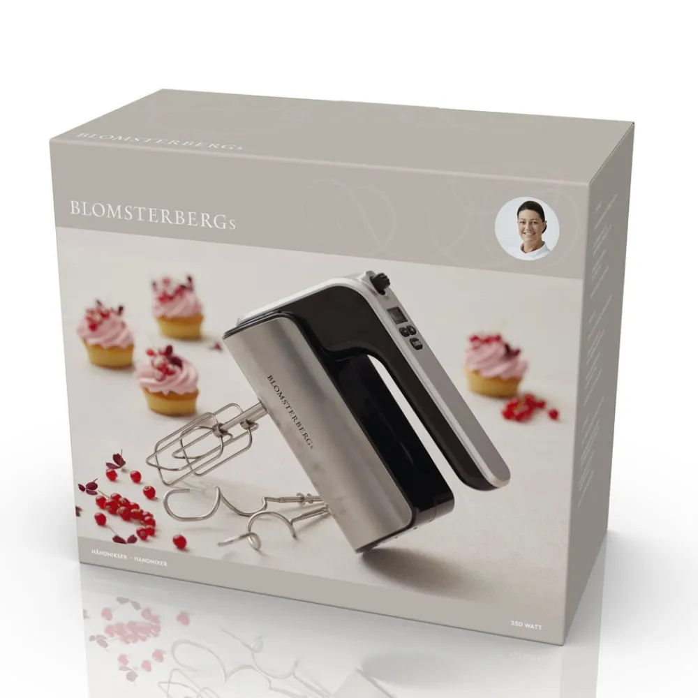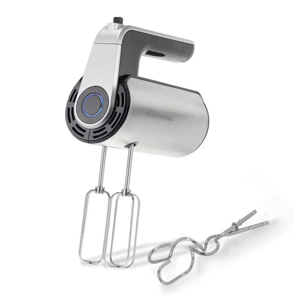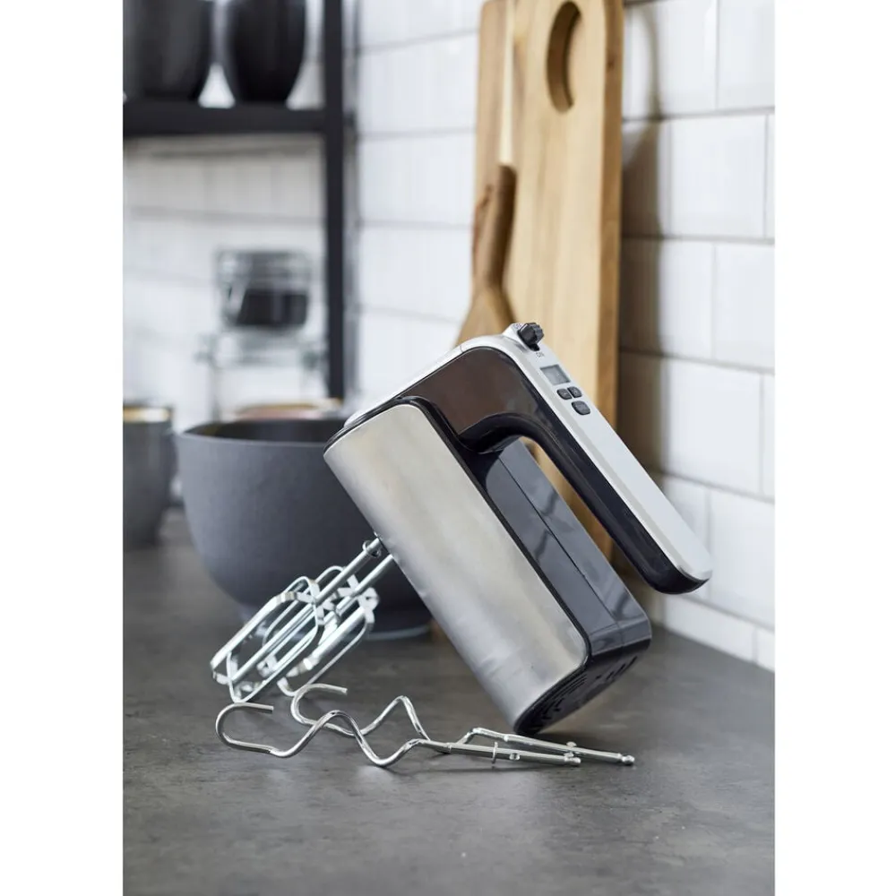 Håndmikser i kompakt design i sort plastik og rustfrit stål med blåt LED display som viser hastighed og tidsforbrug. Fem hastigheder med turbofunktion. 2 almindelige piskeris og 2 dejkroge medfølger. Med individuel udløserknap til piskerisene og 1,5 meter spiralledning.