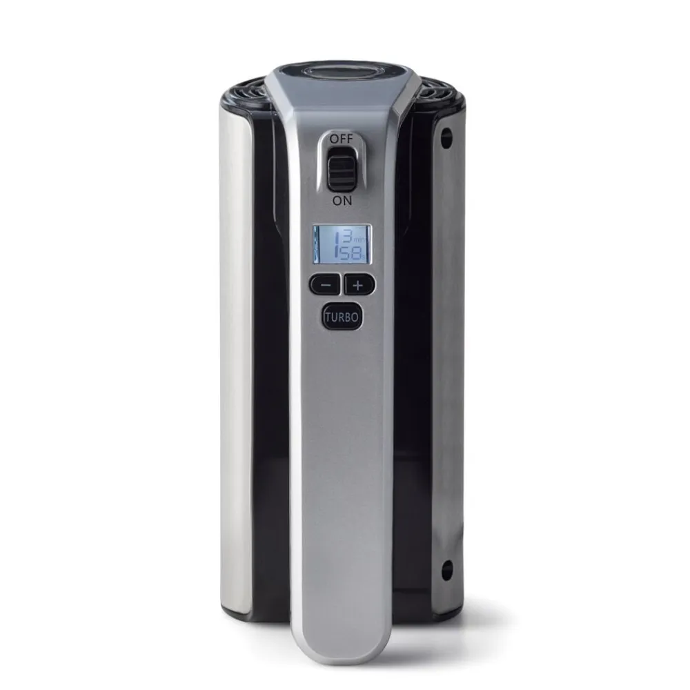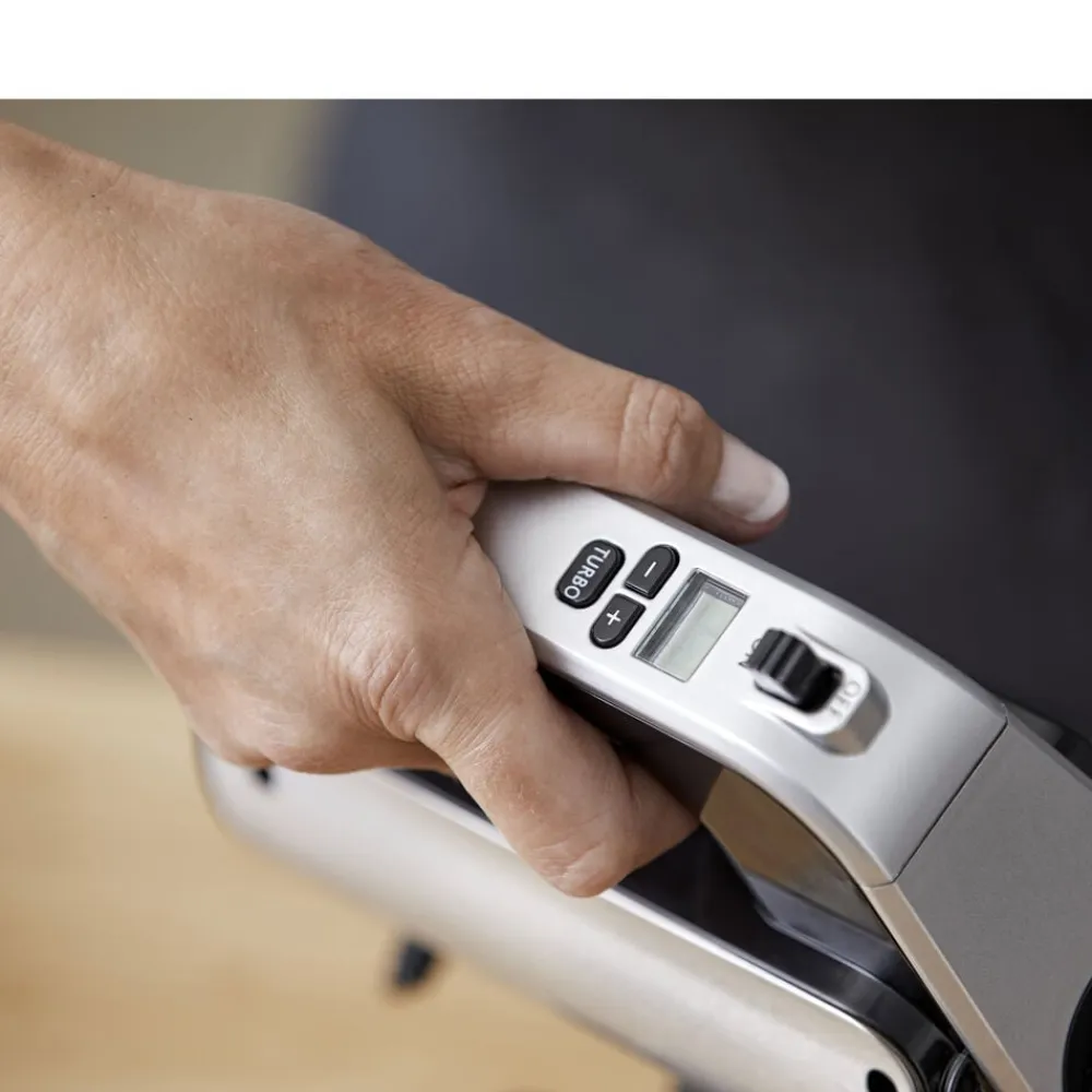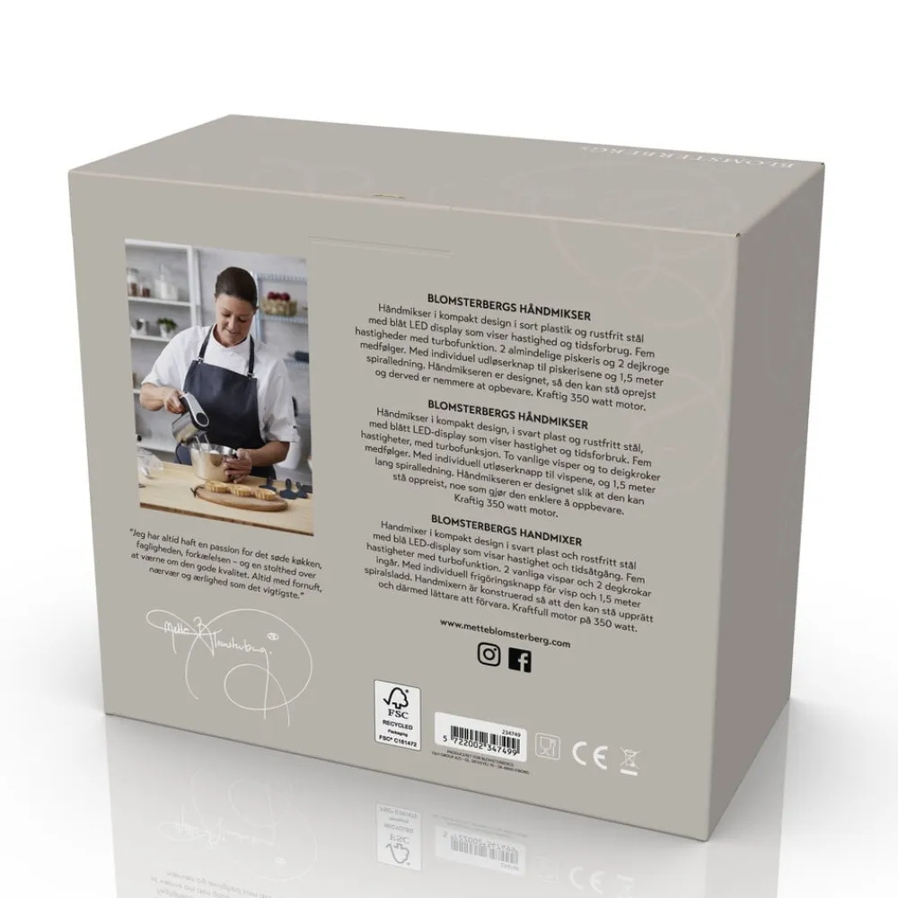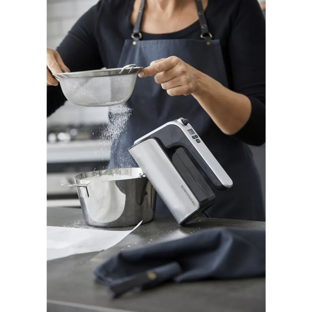 Håndmikser i kompakt design i sort plastik og rustfrit stål med blåt LED display som viser hastighed og tidsforbrug. Fem hastigheder med turbofunktion. 2 almindelige piskeris og 2 dejkroge medfølger. Med individuel udløserknap til piskerisene og 1,5 meter spiralledning.