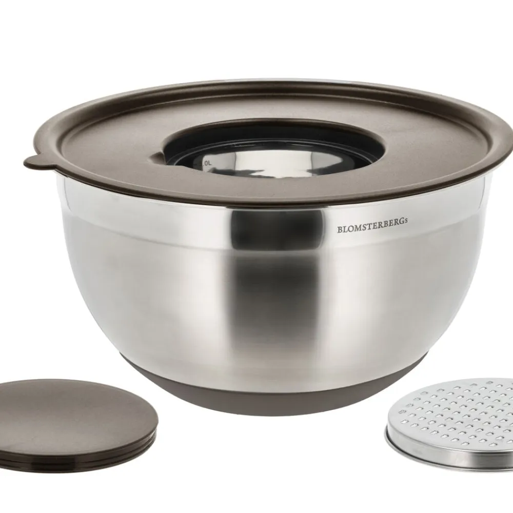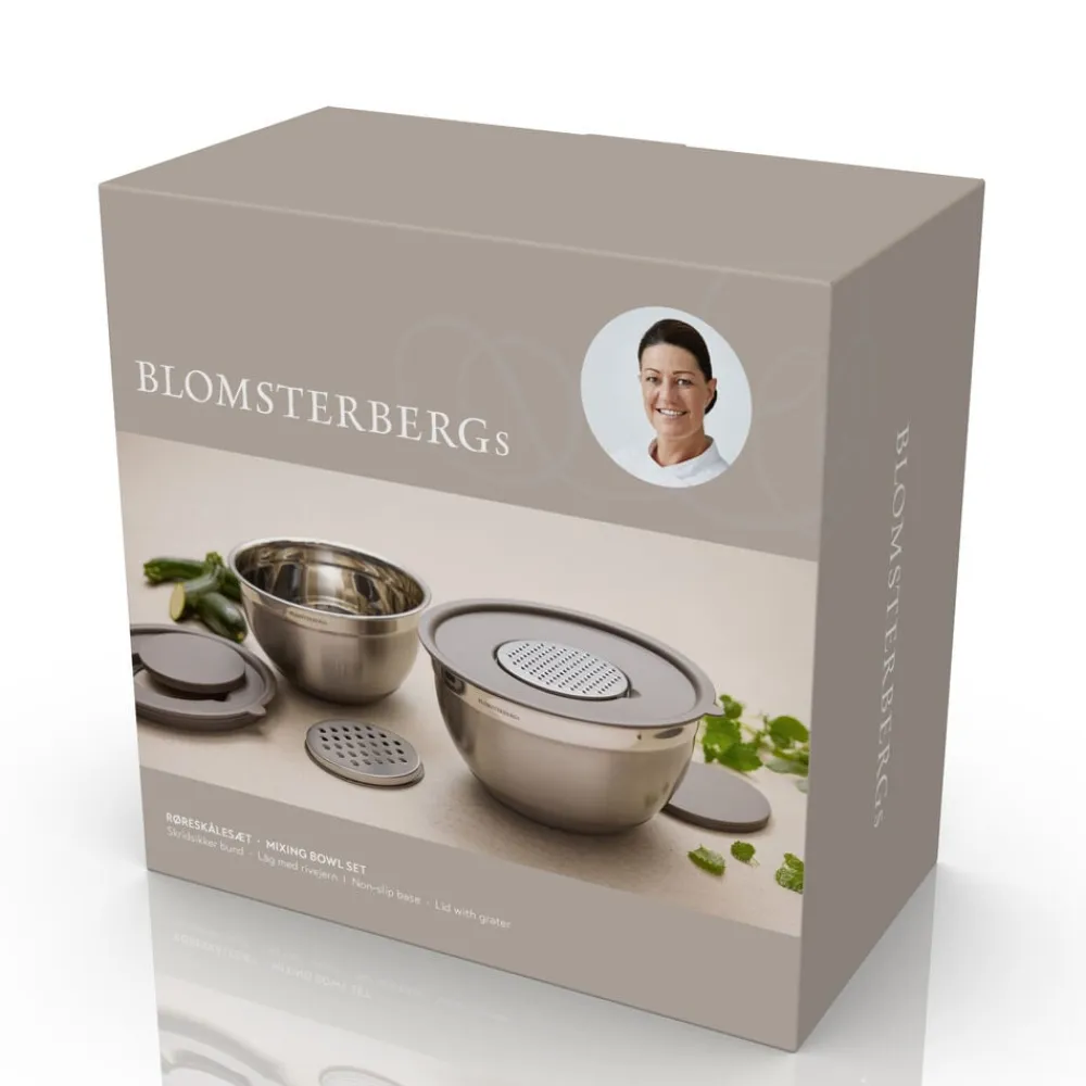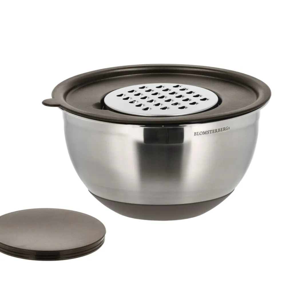 Røreskålesæt i rustfrit stål på 3 og 5 liter. Sættet har ikke bare et lækkert design, men også smarte detaljer. Skålene står solidt på bordet takket være en skridsikker, lattefarvet silikonebund, der både gør dem stabile og pæne at se på. Der medfølger også låg samt to forskellige rivejern, der nemt klikkes fast i låget. En smart løsning, når der skal rives grøntsager eller andet godt direkte ned i skålen.