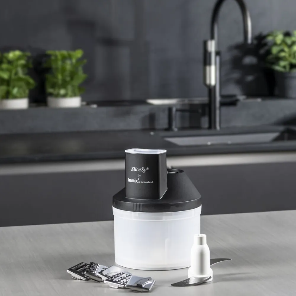 bamix®-tilbehør. SliceSy® til at hakke, rive, snitte og kværne – det hele klaret på den halve tid. Kan også bruges til at røre og blande dej. Produktet har en kapacitet på ca. 6 dl og leveres med 5 knivblade.