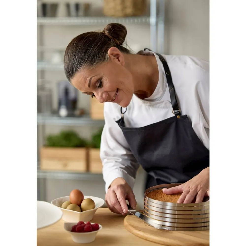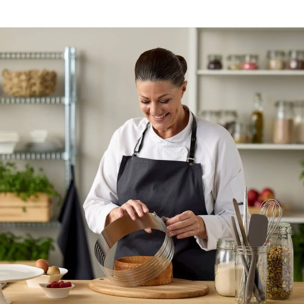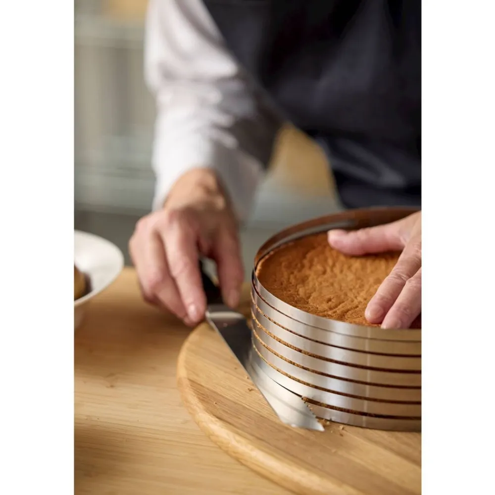 Justerbar kagedeler/kageskærer i rustfrit stål, som er perfekt når kagen skal skæres i ensartede lag. Placer kagedeleren over den færdigbagte kage og skær den i det ønskede mål. Kagedeleren er 8 cm høj og diameteren kan justeres mellem 24 og 30 cm. Tåler både ovn og fryser. Velegnet til opvaskemaskine. Vaskes i opvaskemaskine før første brug.