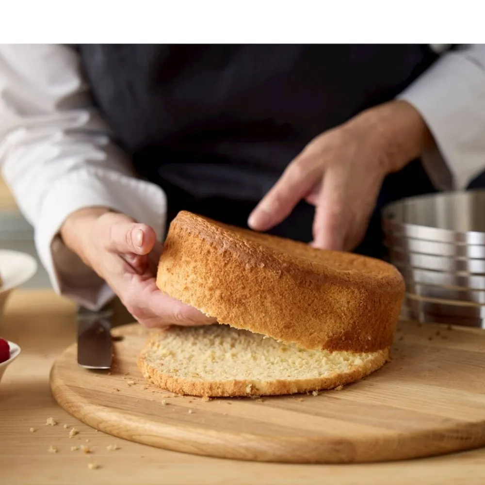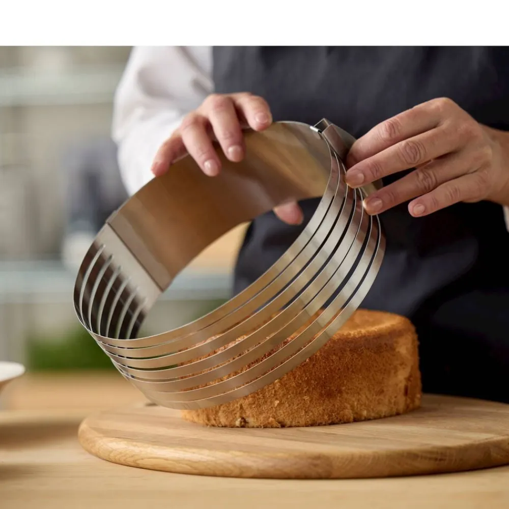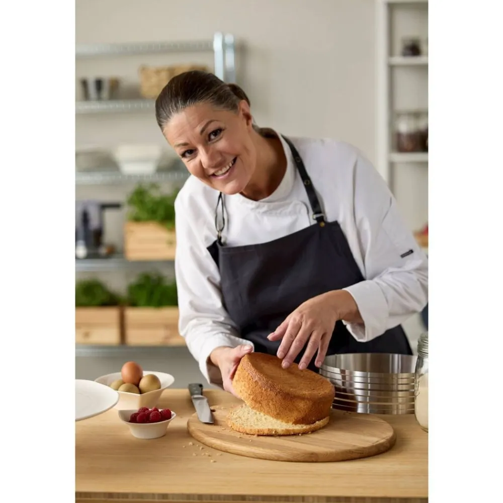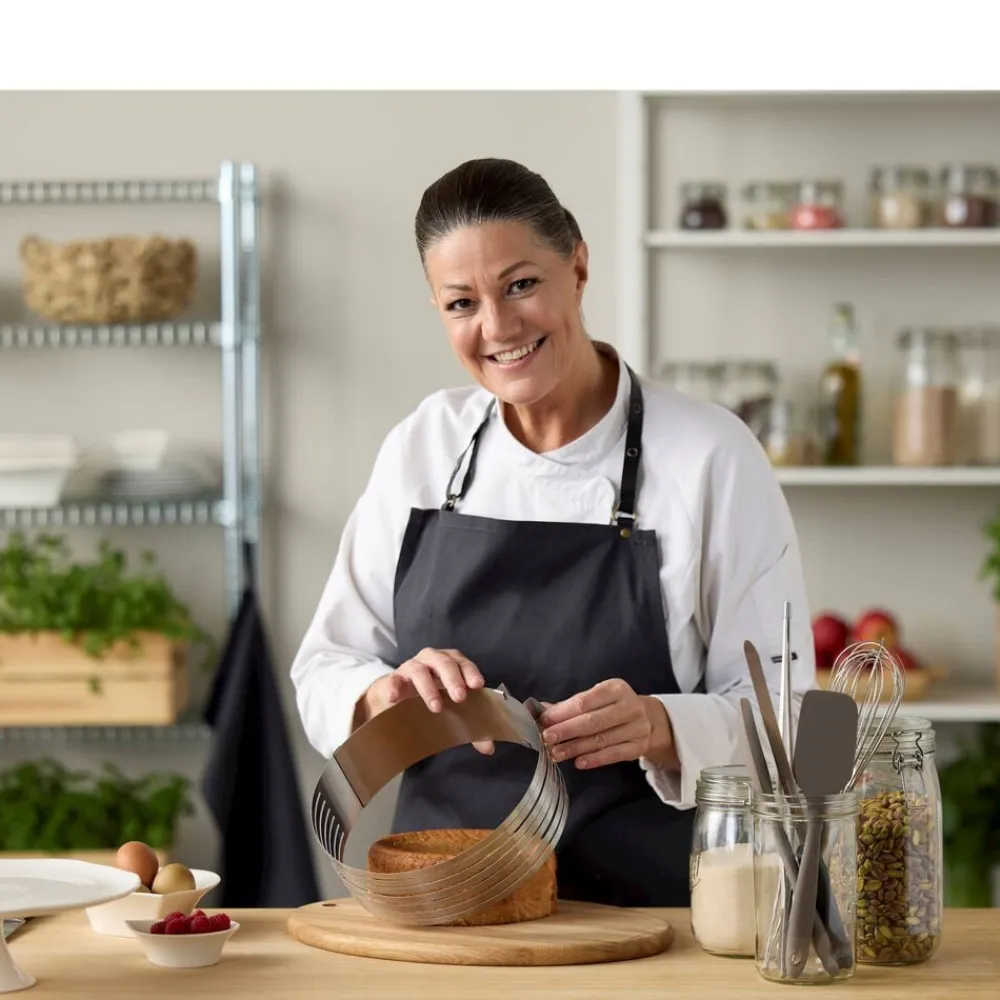 Justerbar kagedeler/kageskærer i rustfrit stål, som er perfekt når kagen skal skæres i ensartede lag. Placer kagedeleren over den færdigbagte kage og skær den i det ønskede mål. Kagedeleren er 8 cm høj og diameteren kan justeres mellem 24 og 30 cm. Tåler både ovn og fryser. Velegnet til opvaskemaskine. Vaskes i opvaskemaskine før første brug.