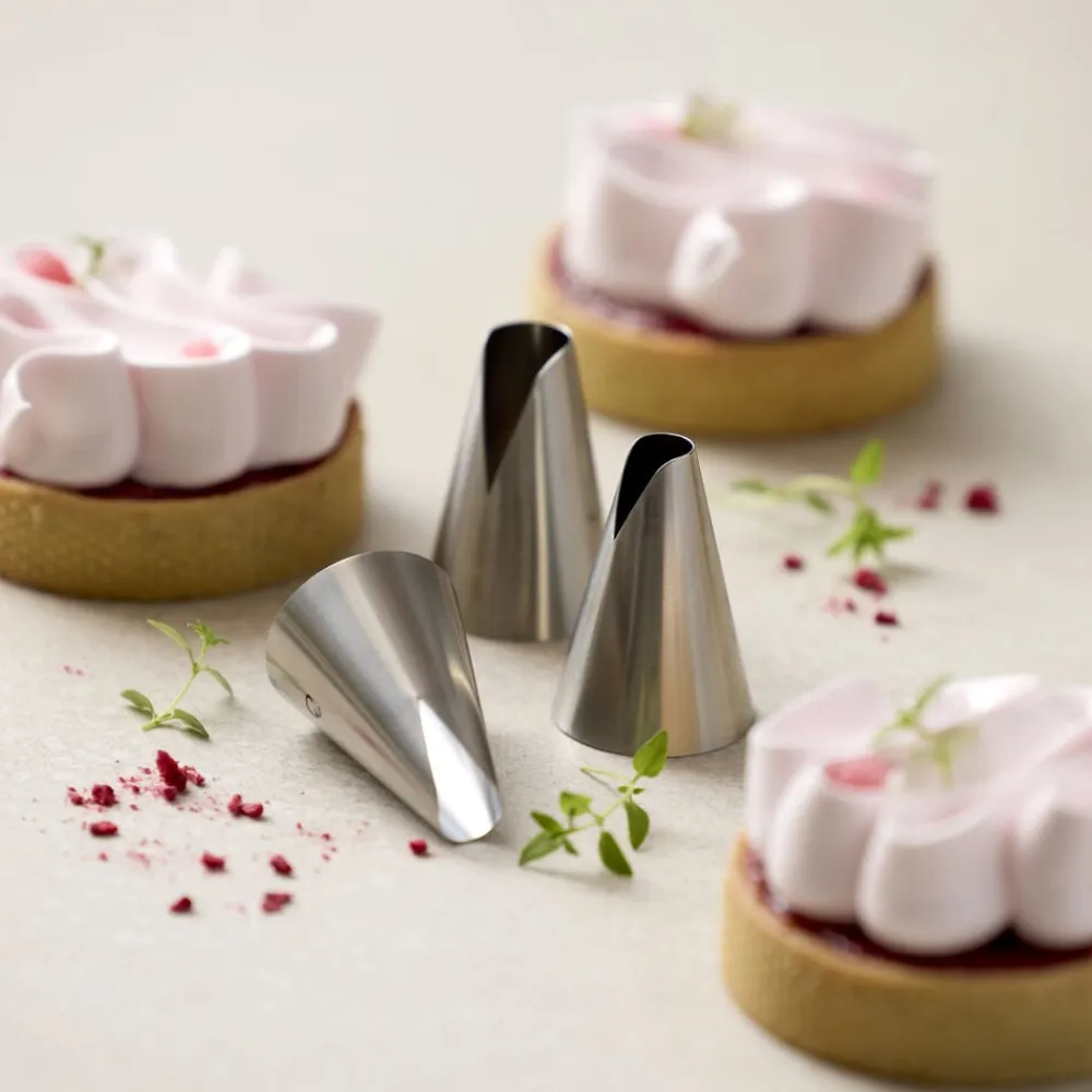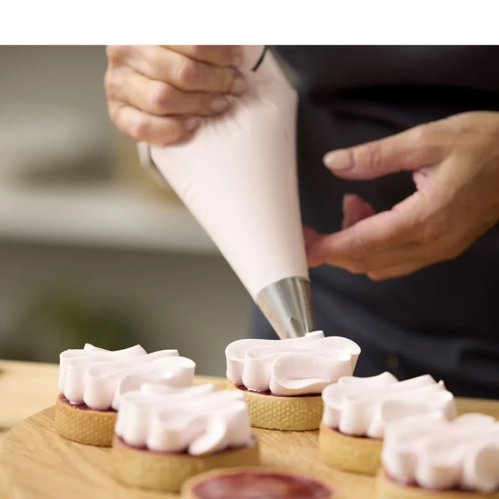 Tyllesættet indeholder tre tyller, der gør det muligt at lave de fineste dekorationer på dit bagværk. Uanset om du arbejder med marengs, smørcreme, piskede cremer, blød kransekagemasse eller småkagedej, er tyllesættet perfekt til at skabe dekorative mesterværker, der vil imponere enhver. Vaskes i opvaskemaskine før første brug.