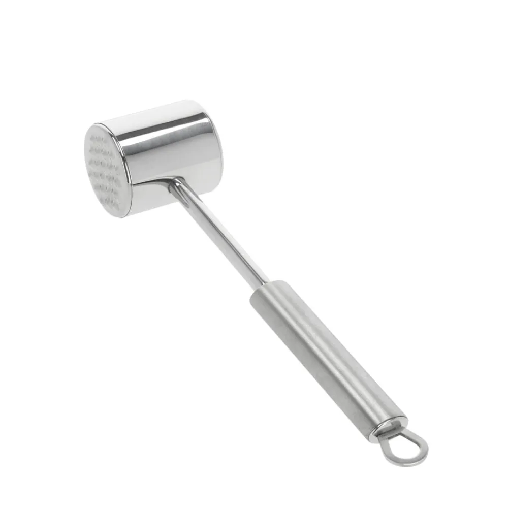 Den solide kødhammer i rustfrit stål har en god tyngde og ligger godt i hånden. Den kan nemt hænges op i krogen for enden af grebet, når du ikke bruger redskabet. Det dobbeltsidede hammerhoved er glat på den ene ende og har et knopmønster på den anden. På den måde kan du nemt mørne og forme kød eller grøntsager med præcision. Kødhammeren kan hænges op i krogen i enden af grebet og pynte i køkkenet, når du ikke bruger redskabet. Velegnet til opvaskemaskine.