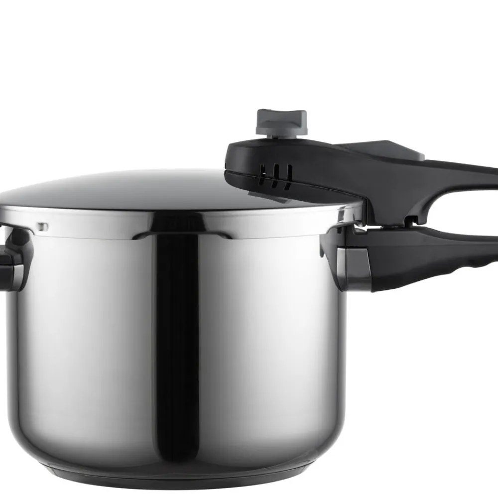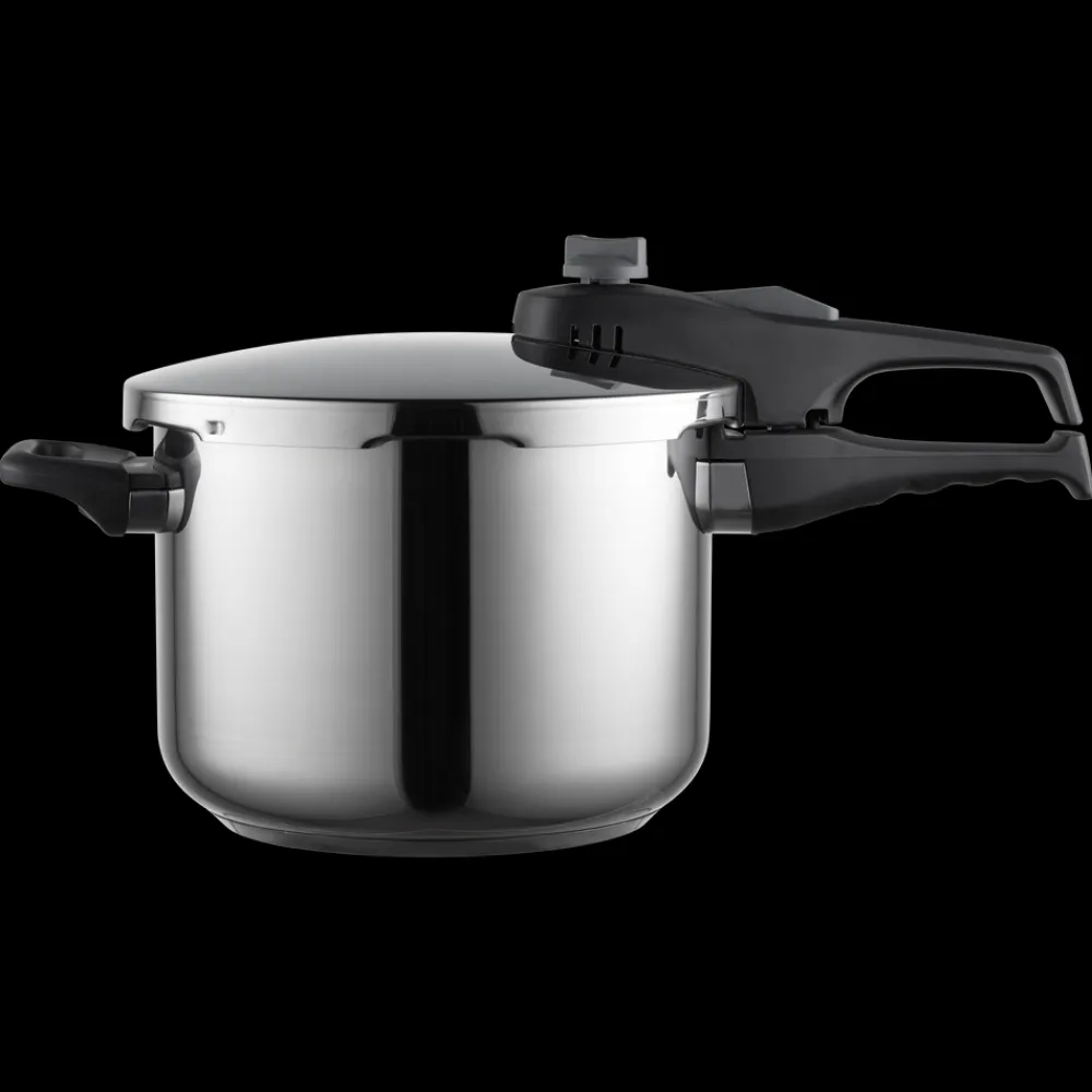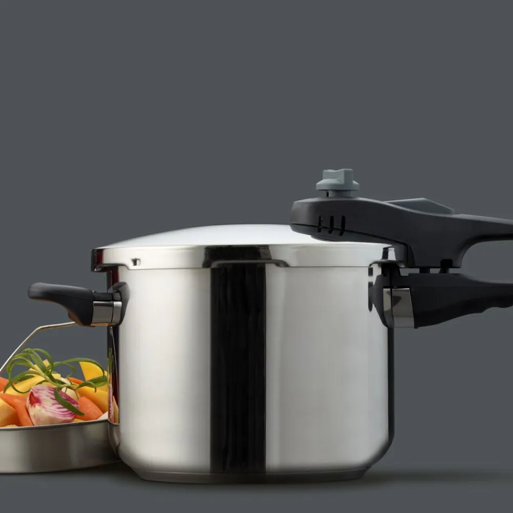 Trykkogerens elegante design i rustfrit stål gør ikke kun madlavningen nemmere, men tilfører også et stilrent præg til dit køkken.