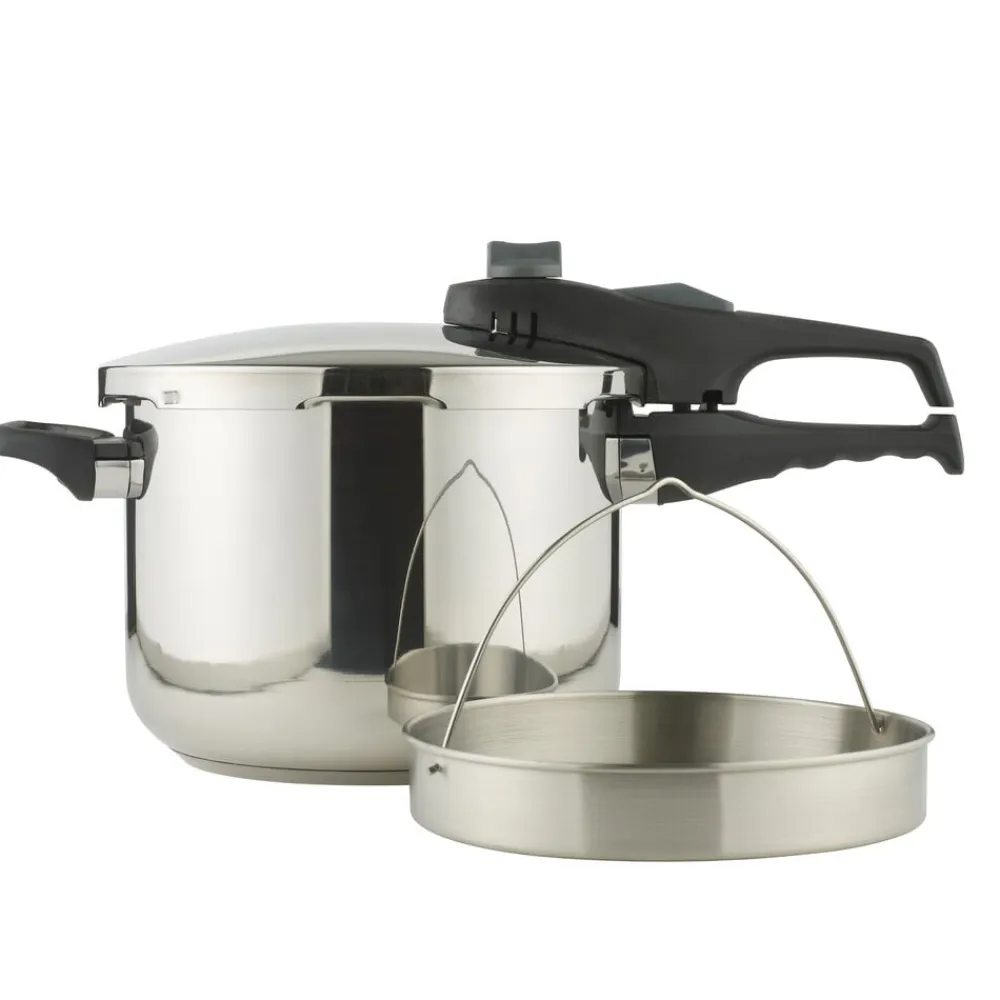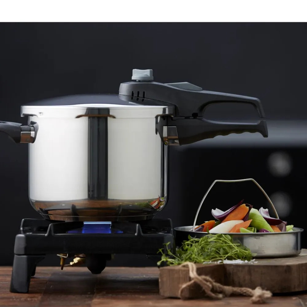 Trykkogeren fra lader dig tilberede mad på en brøkdel af tiden og bevarer samtidig smag og næringsstoffer. Justér nemt trykket med de to indbyggede tryktrin (0,6 bar og 0,9 bar), så du kan lave alt fra blide grøntsager til saftige kødretter. Brug den på alle varmekilder – også induktion – og gør madlavningen fleksibel og problemfri.