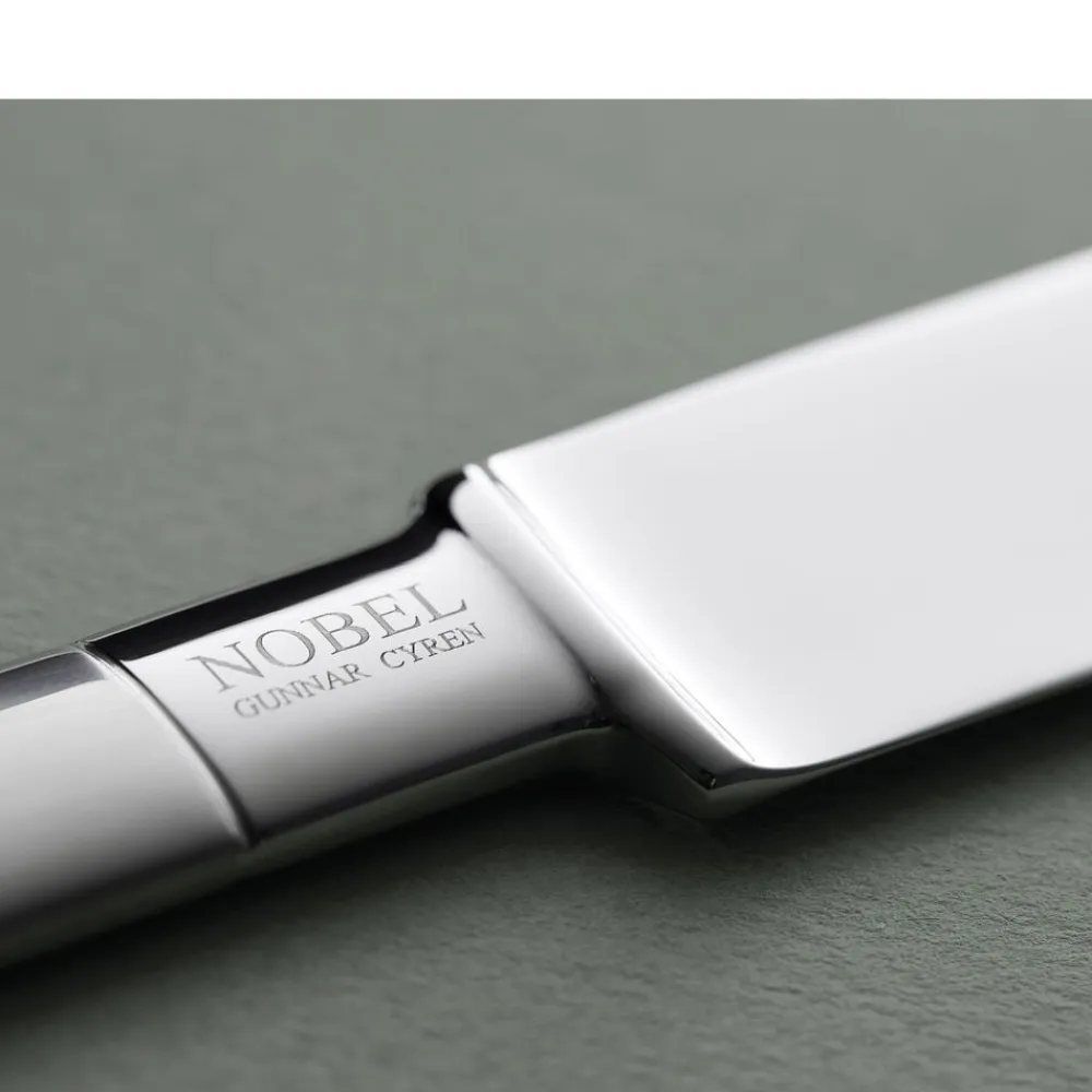 Nobel blev skabt af Gunnar Cyrén til Nobelprisudelingens 90-års jubilæum og er allerede blevet en klassiker. Bestikket er inspireret af begyndelsen af 1800-tallet og Karl XIV Johans sølvbestik. Et bestik, der er umiskendeligt svensk, men med nye detaljer, der overrasker. Nobel tilføjer det ekstra – uanset om du vælger at dække op helt traditionelt med hvide duge og kandelabre, eller moderne og trendy med nye materialer og borddekorationer. Nobel er fremstillet af rustfrit stål med let børstet skaft og højglanspoleret hoved, og det bruges stadig ved den årlige uddeling af Nobelprisen i Stockholm. Tåler opvaskemaskine.