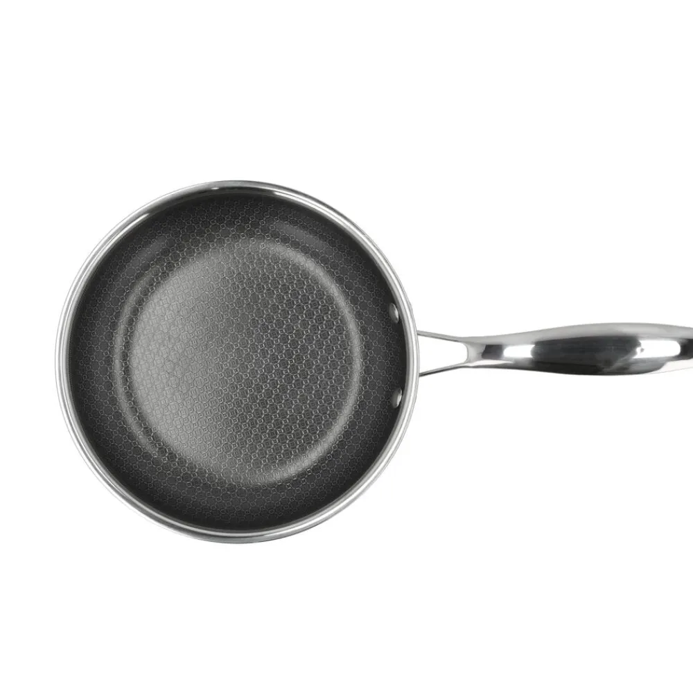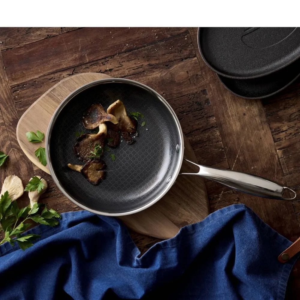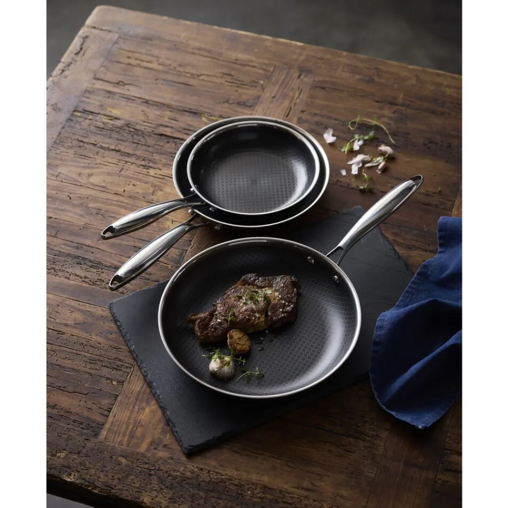 Hybrid 3ply-serien er fremstillet af rustfrit stål med keramisk hybrid-belægning, der sikrer gode stegeegenskaber og let rengøring. Bemærk, at 3-ply-konstruktionen med sin struktur af to lag rustfrit stål og et lag aluminium i midten, opvarmes meget hurtigt. Vær derfor forsigtig med ikke at overophede, men varm gryder og pander langsomt op.