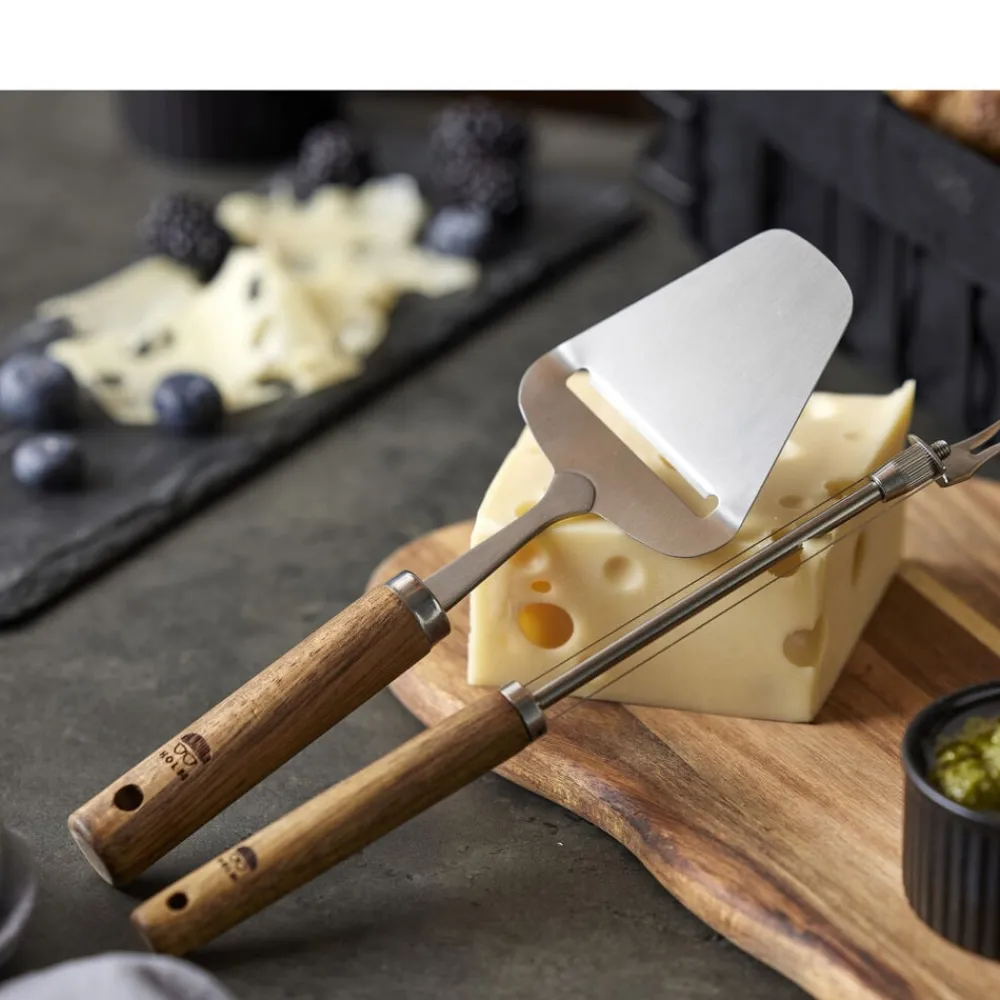 Den klassiske osteskærer har fået en smuk opgradering med et håndtag af lækkert akacietræ. Du kan skære osteskiver i to tykkelser og let flytte skiven ved at spidde den med osteskærerens dobbeltspids. Vask ikke produkter af træ i opvaskemaskine. Vi anbefaler håndopvask og efterbehandling af håndtaget med smagsneutral olie et par gange om året. Der medfølger to reservestrenge.