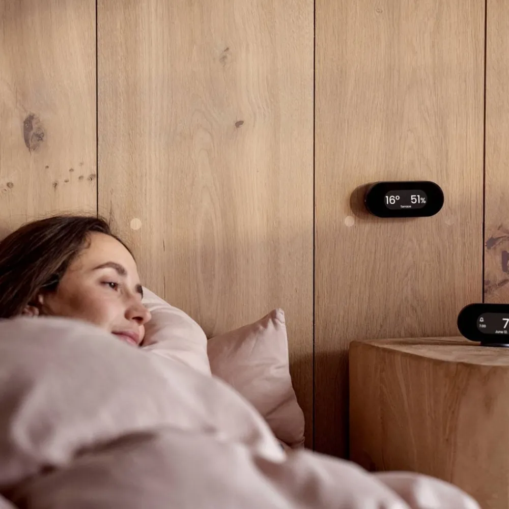 Klimastationen kan parres med Jacob Jensen sensor-enheder, hvilket giver dig mulighed for at overvåge både temperatur og luftfugtighed flere steder i dit hjem, både inde og ude, fra din hovedenhed. Du kan tilføje op til fire sensorer til din hovedenhed og vælge mellem 16 foruddefinerede placeringer i en afstand på op til 30 meter fra hovedenheden. Sensor-enhederne sælges separat.