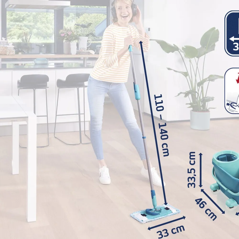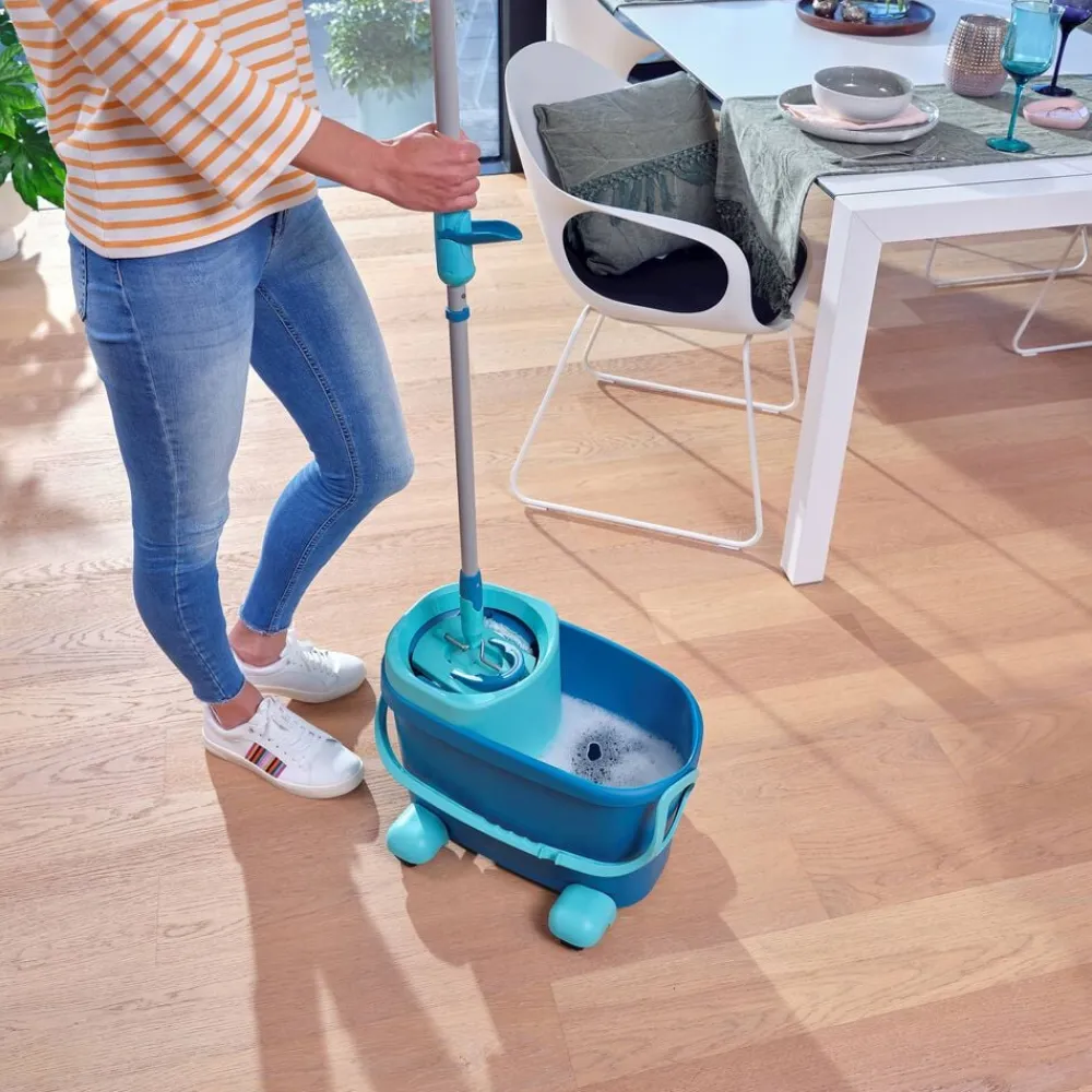Centrifugeringsteknologien presser overskydende vand ud af moppen, når den ‘pumpes’ i spandens vrider, og frigiver både snavset vand og snavs inde fra fibrene. Du kan nemt bestemme, hvor fugtig moppen skal være, samtidig med at du får en bedre arbejdsstilling og undgår at skulle have hænderne i vandet. Teleskophåndtag med 360° kugleleje gør det muligt at føre moppen rundt i bølgede linjer og gøre rent under møbler. Under rengøring kan spanden skubbes rundt uden problemer ved hjælp af rullevognen. Den superbløde moppeklud kan maskinvaskes ved 60 grader.