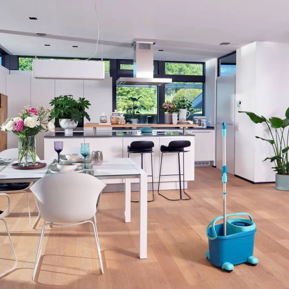 Clean Twist M Ergo Mobile-sættet indeholder alt, hvad der kræves til grundig rengøring af alle gulvtyper. Den består af et teleskophåndtag med patenteret centrifugeringsteknologi, en 6 l spand med snurrevrider, en superblød moppeklud og en vogn på hjul.