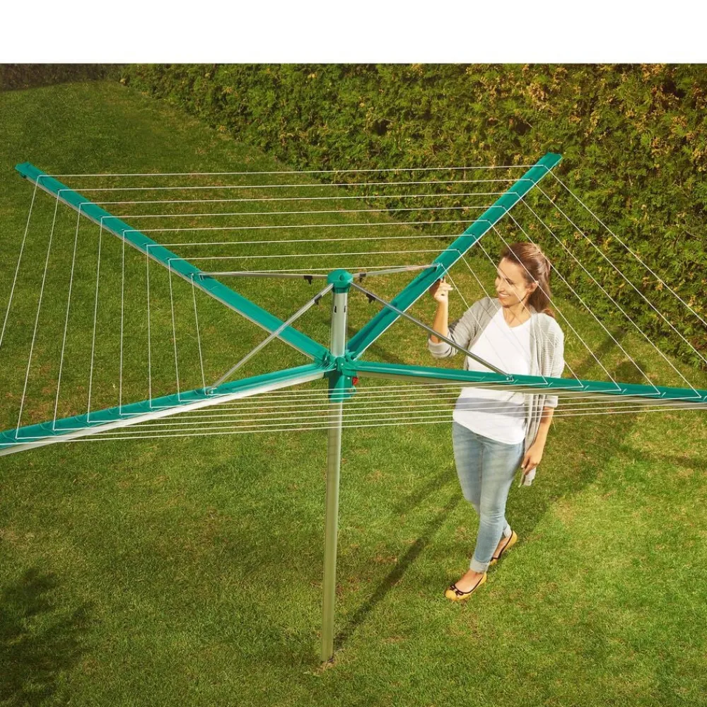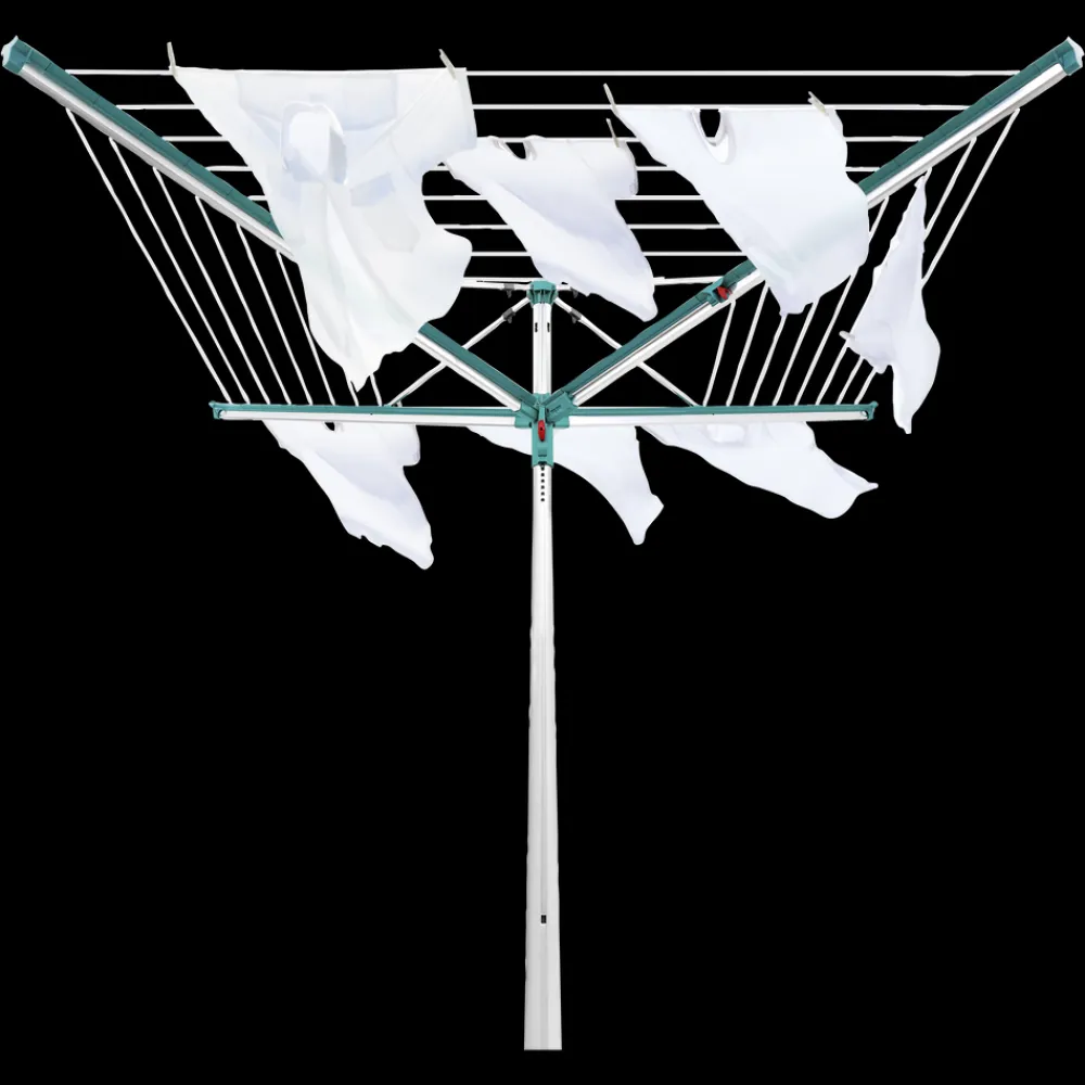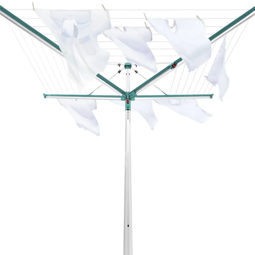 Linomatic 500 Deluxe Cover paraplytørrestativ til ca. 5 maskinfulde vasketøj og med 50 meter tørreplads. Den yderste line er 2,03 meter, og det giver god mulighed for tørring af fx sengetøj, lagner og duge. Easy-Lift system gør det nemt at slå stativet op ved blot et enkelt træk i en snor. Easy-Close-Comfort funktion med en trykknap der låser de foldbare arme op, så stativet nemt kan slås sammen, når det ikke er i brug. De UV-bestandige liner trækkes automatisk ind i stativet når det lukkes, og derfor bliver linerne ikke beskidte og slidte. Stativets lukkemekanisme sikrer, at linerne altid er opstrammede. Der medfølger et praktisk beskyttelsesovertræk, som holder stativet rent, når det ikke er i brug samt en holder til nedstøbning. 3 års garanti.