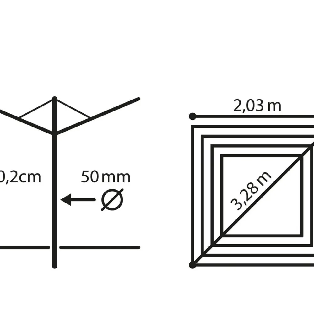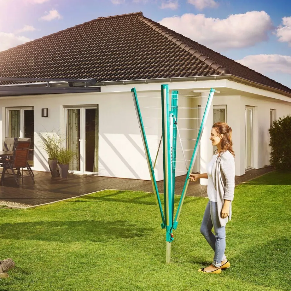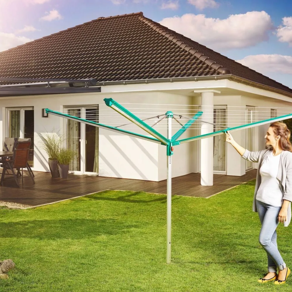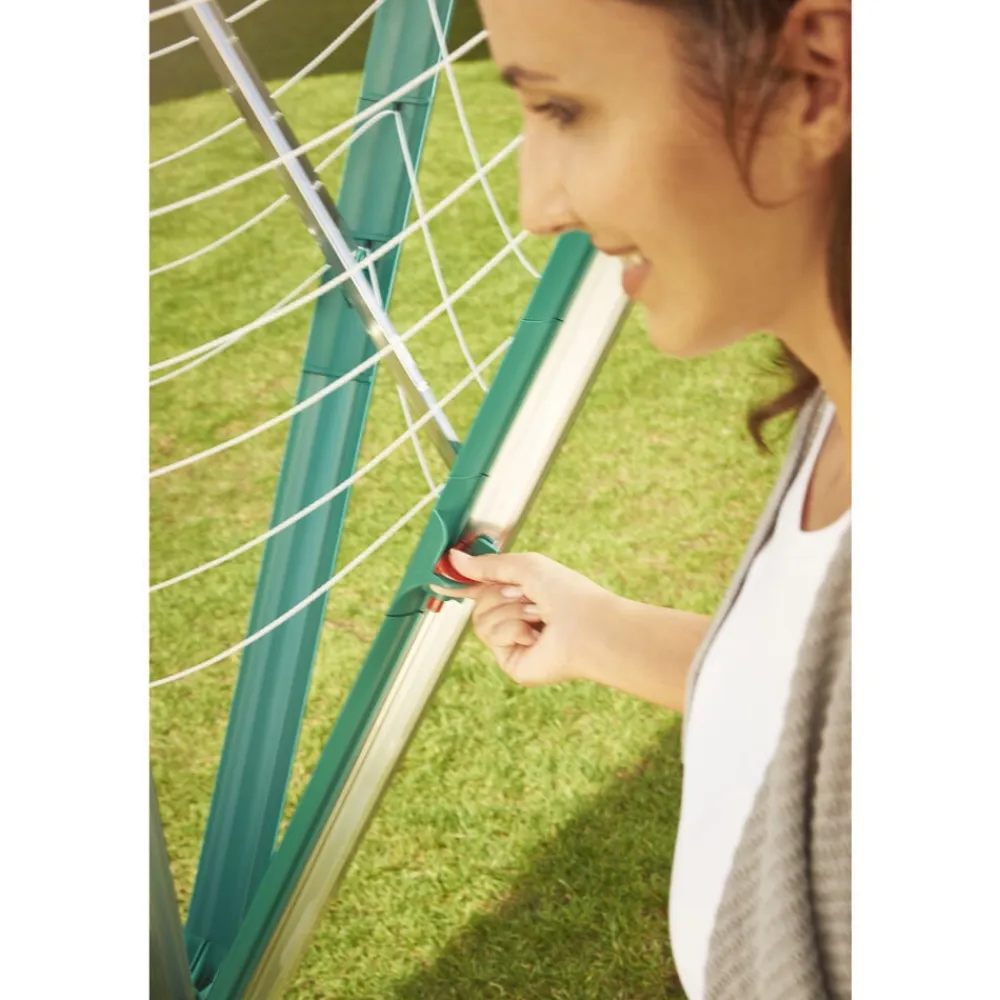 Linomatic 500 Deluxe Cover paraplytørrestativ til ca. 5 maskinfulde vasketøj og med 50 meter tørreplads. Den yderste line er 2,03 meter, og det giver god mulighed for tørring af fx sengetøj, lagner og duge. Easy-Lift system gør det nemt at slå stativet op ved blot et enkelt træk i en snor. Easy-Close-Comfort funktion med en trykknap der låser de foldbare arme op, så stativet nemt kan slås sammen, når det ikke er i brug. De UV-bestandige liner trækkes automatisk ind i stativet når det lukkes, og derfor bliver linerne ikke beskidte og slidte. Stativets lukkemekanisme sikrer, at linerne altid er opstrammede. Der medfølger et praktisk beskyttelsesovertræk, som holder stativet rent, når det ikke er i brug samt en holder til nedstøbning. 3 års garanti.