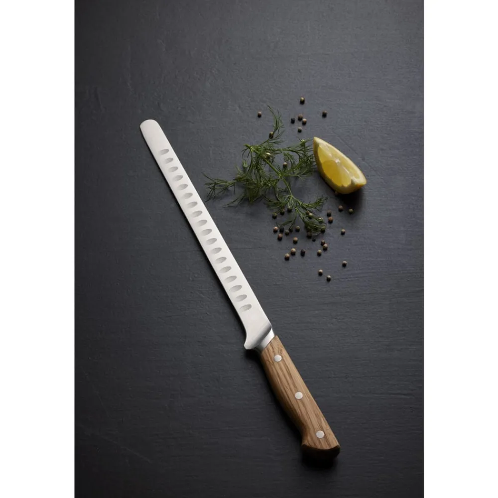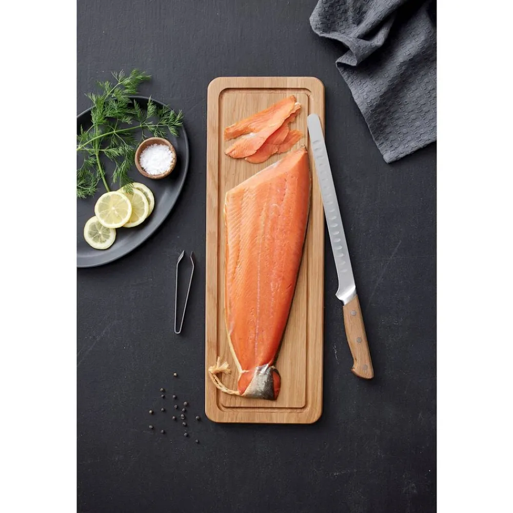 Den smukke og funktionelle laksekniv er velegnet til udskæring af laks og andre lignende fisk. Bladets udformning og fleksibilitet gør, at du nemt og ubesværet kan filetere fisk, uden at noget går til spilde, samt skære flotte, tynde og ensartede skiver af fisken, perfekt til sushi og sashimi.